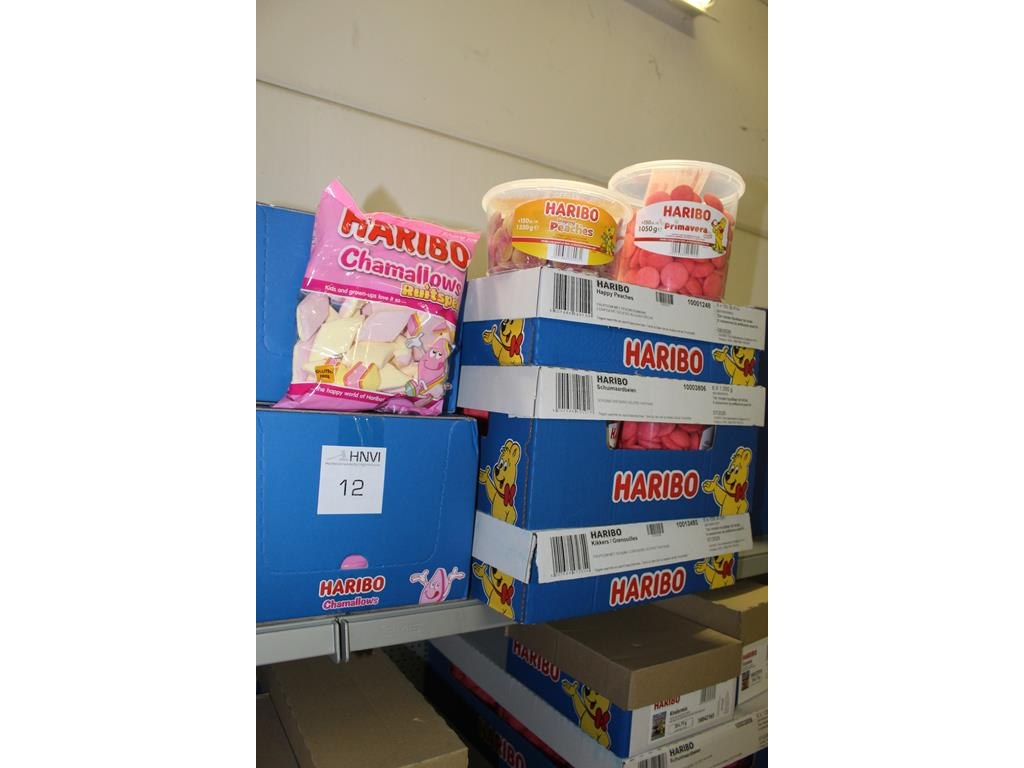 Vijf dozen haribo w.o. happy peaches, schuimaardbeien, kikkers en spekjes. tht o.a. 07-08-2026.