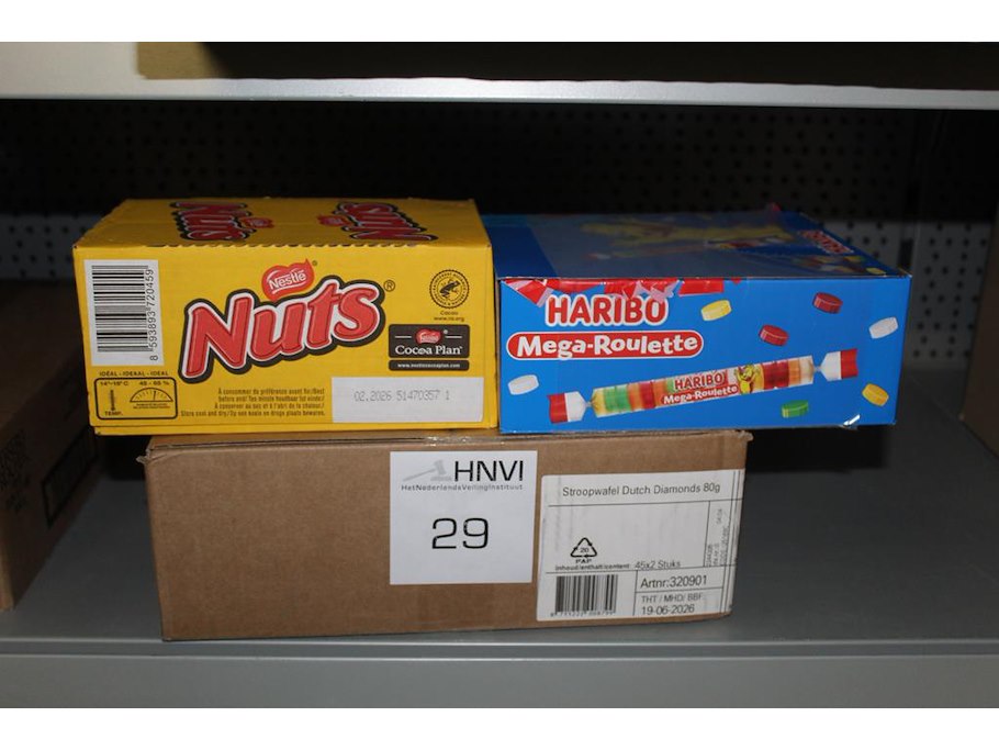 Drie dozen snoepgoed w.o. nootjes, mega-rouletten en stroopwafels. THT 06-2026.
