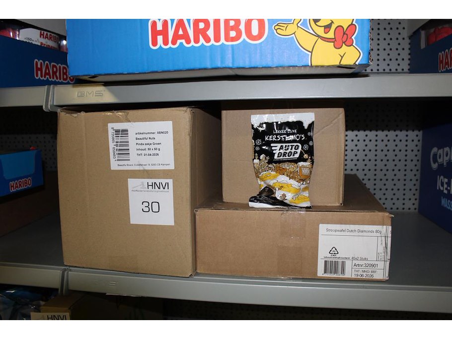 Drie dozen snoepgoed w.o. stroopwafels, nootjes en autodrop. THT 06-2026.