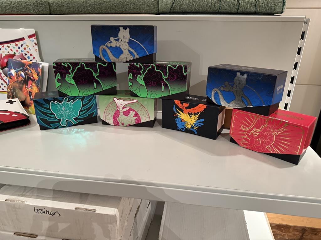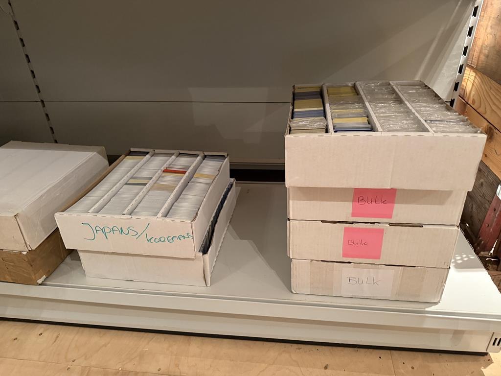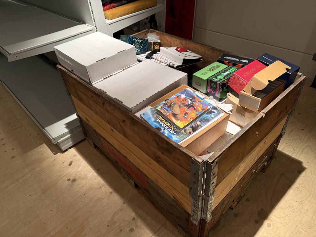 Box 2. POKEMON producten op drie stellingschappen w.o. POKEMON kaarten, Pins Pokemon blikken, Pokemon verzamelmappen, Pokemon Trainers kaarten, One Piece kaarten en Lorcana kaarten