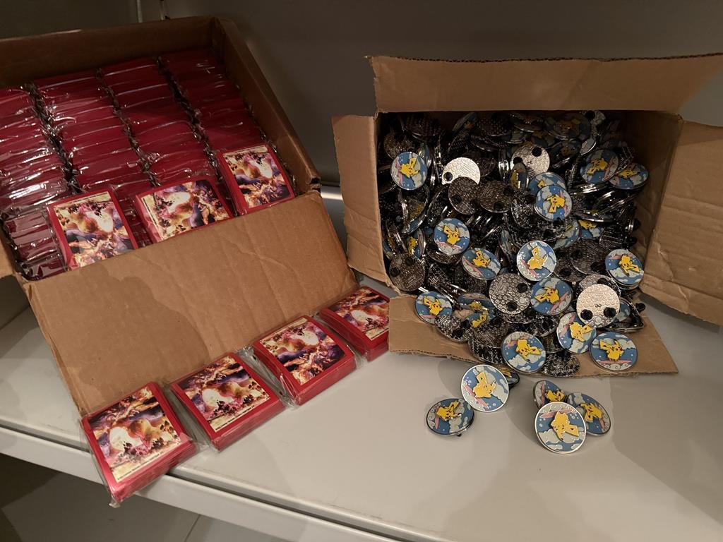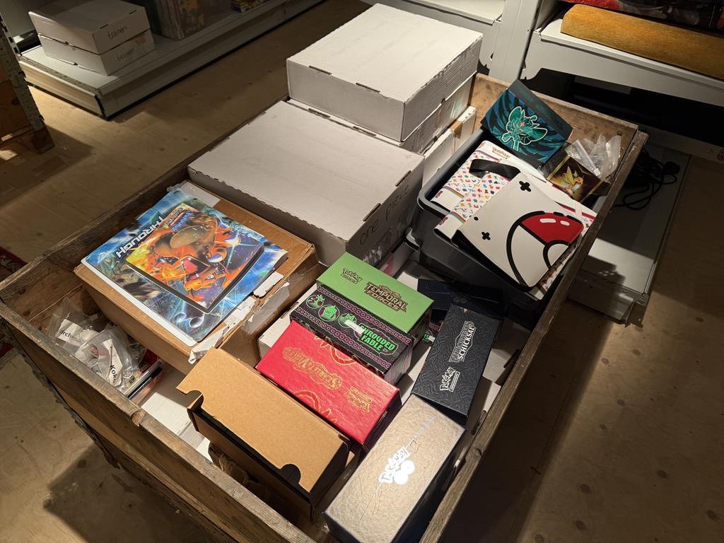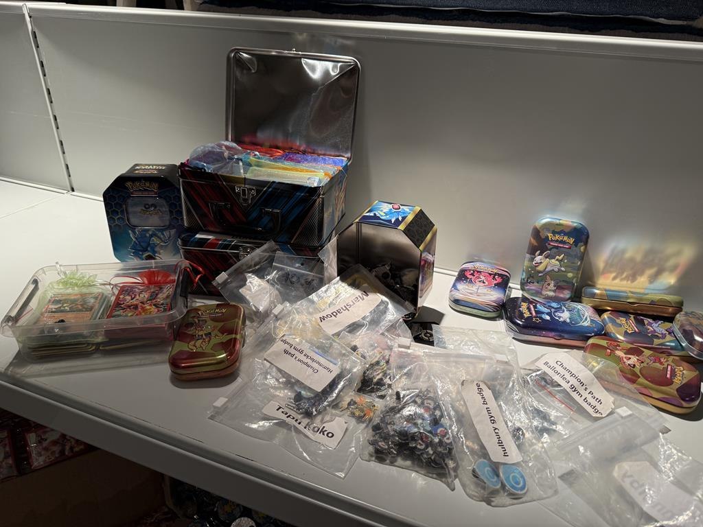 Pokemon producten op drie stellingschappen w.o. pokemon kaarten, pins pokemon blikken, pokemon verzamelmapp... onderdeel van combinatiekavel kavels p001 t/m p051 combinatiekavel