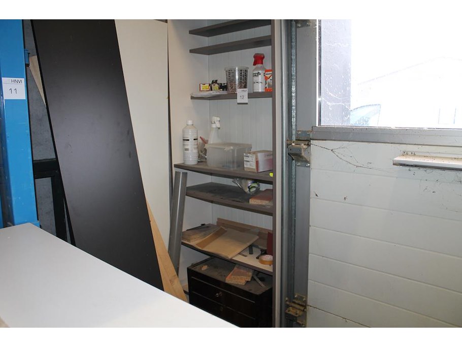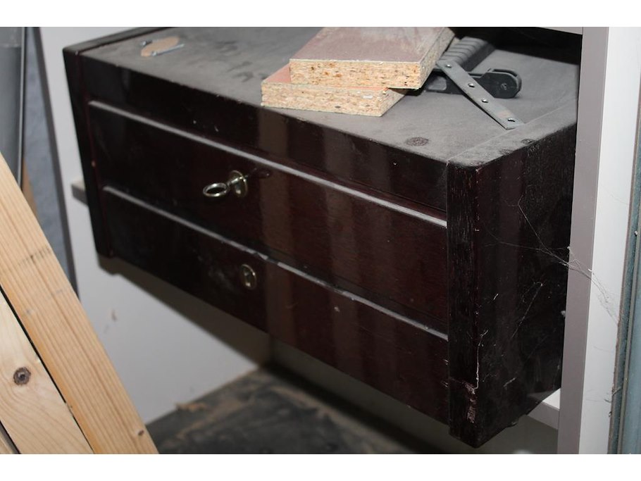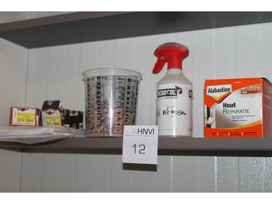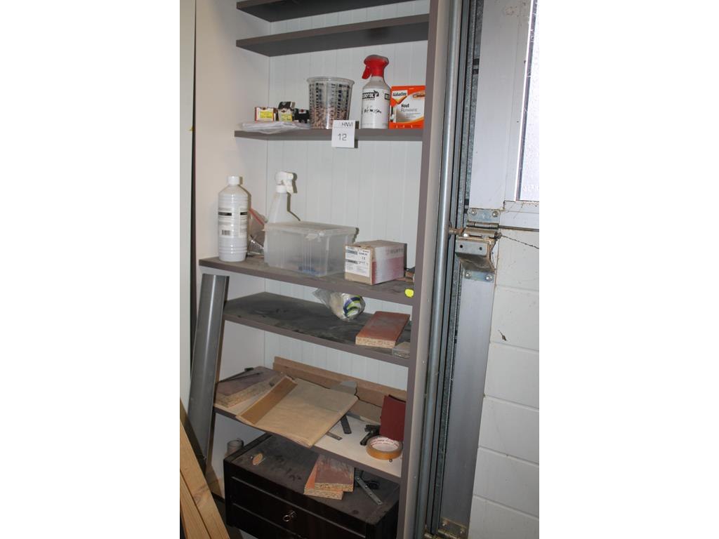 Inhoud werkkast waaronder ladekastje, stofzuigerzakken, schroeven, deuvels en houtreparatie.
