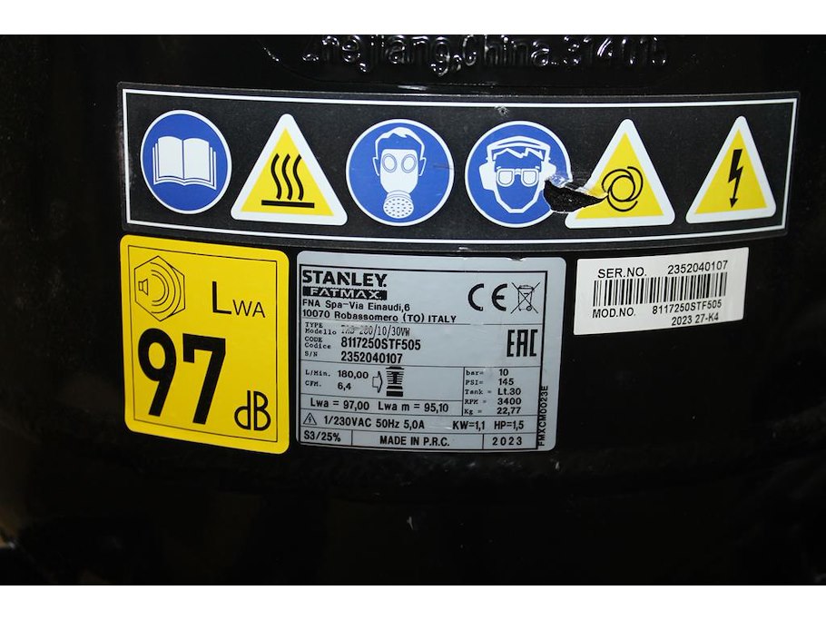 Compressor STANLEY Fatmax met diverse slangen en spuitmond. Bouwjaar 2023