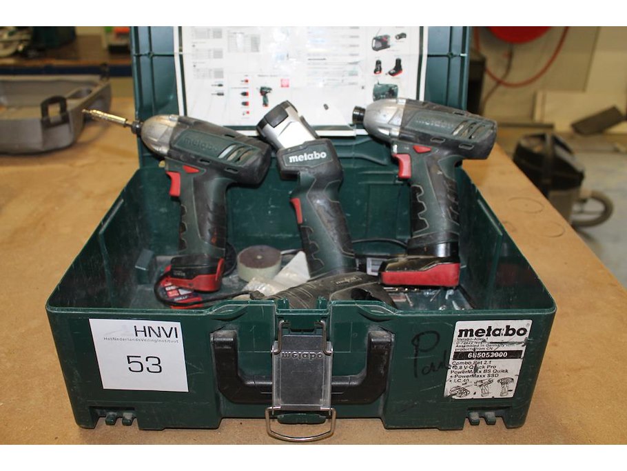 Accuset metabo bestaande uit twee schroefmachines, ledlamp, twee accu's en acculader in kunststof metabox.
