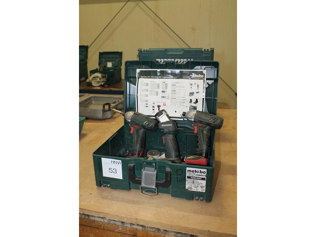 Accuset METABO bestaande uit twee schroefmachines, Ledlamp, twee accu's en acculader in kunststof Metabox.