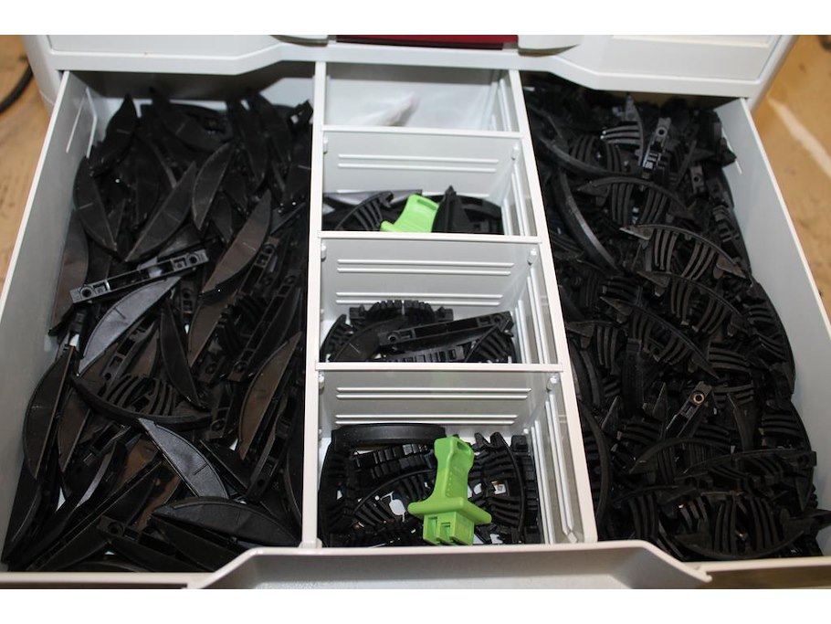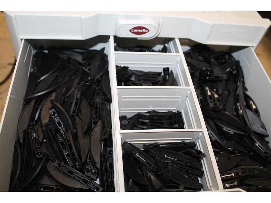 Kunststof ladekastje lamello gevuld met accessoires en kunststof (schuif)lamello's.