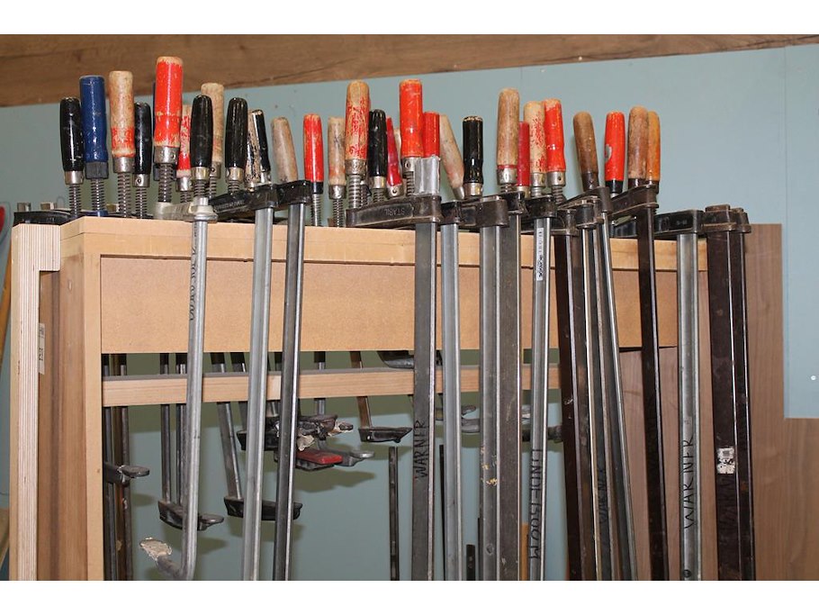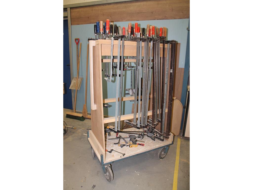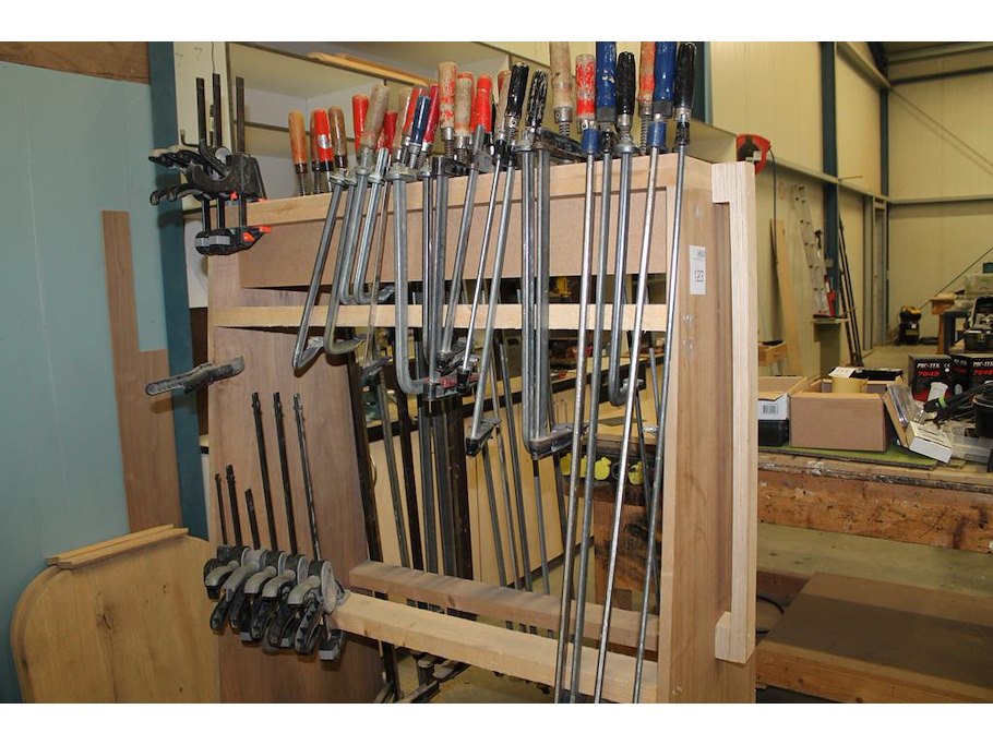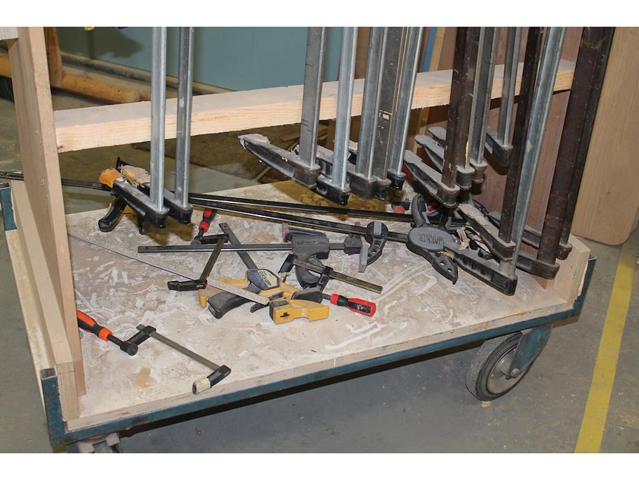 Circa 50 lijmklemmen in diverse maten en uitvoeringen, waaronder met lengte 30 cm op verrijdbare kar.