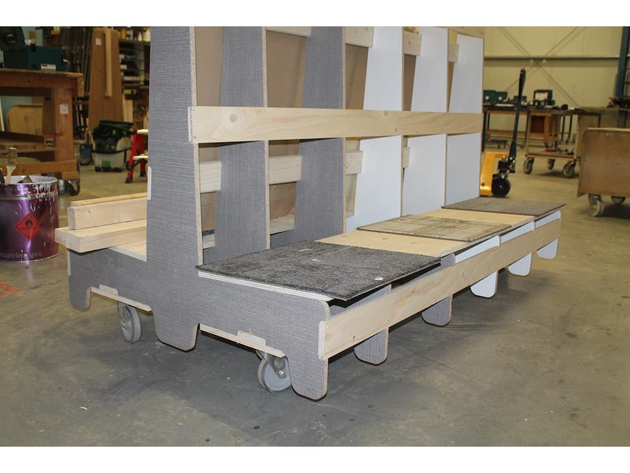 Verrijdbare houten platenkar. afmeting 200 x 110 x 182 cm.