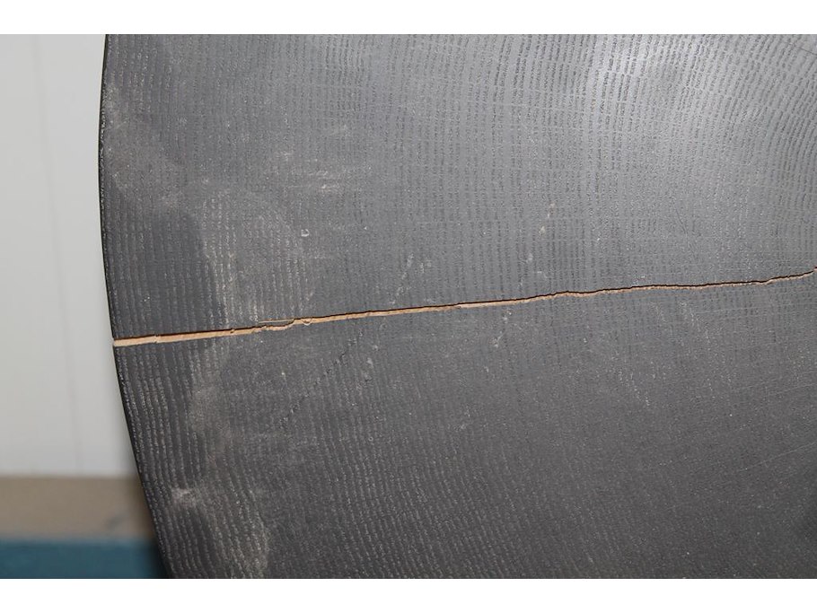 Tafelblad uit een schijf boomhout met doorsnede circa 83 cm en dikte 35 mm. Let op! Krimpscheur in blad.
