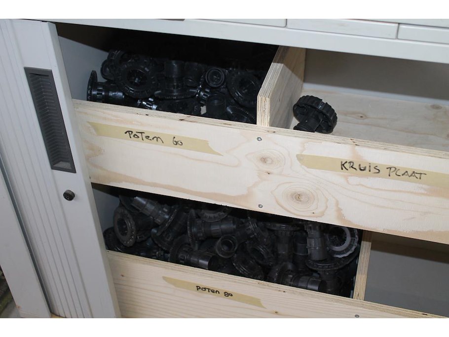Inhoud magazijnkast en metalen bak met scharnieren blum in diverse uitvoeringen en meubelpoten.