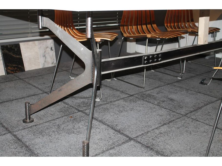 Tafel met massief eikenhouten blad 18 mm en metalen demontabel onderstel. Afmeting 95 x 300 x 74 cm.