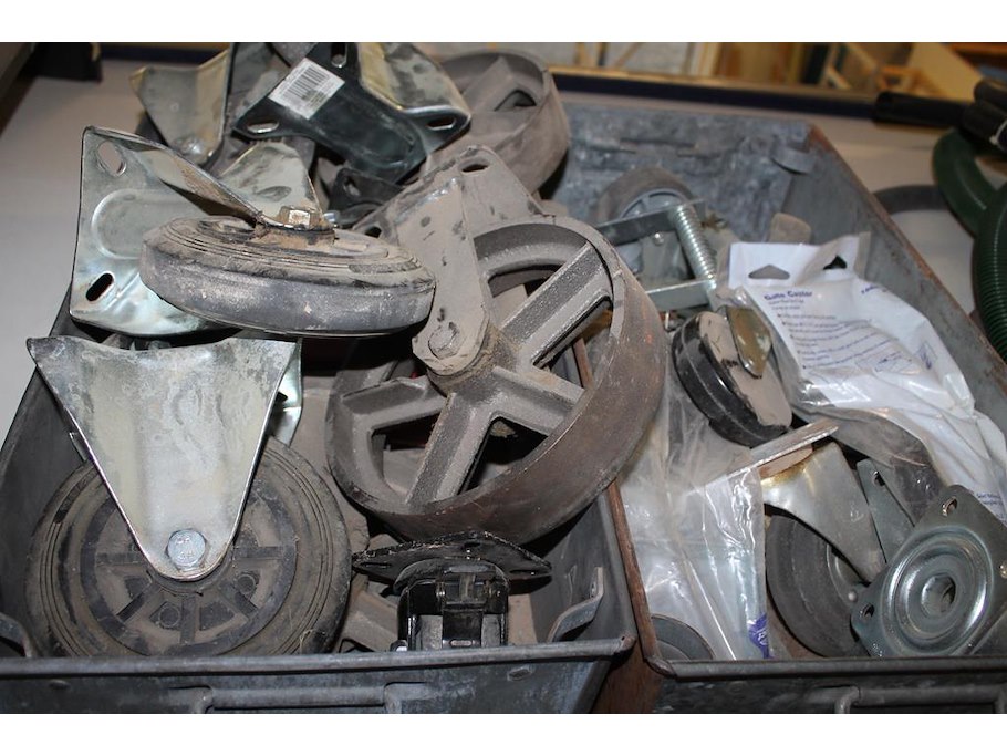 Transportwieltjes in diverse maten en uitvoeringen in twee metalen boxen.