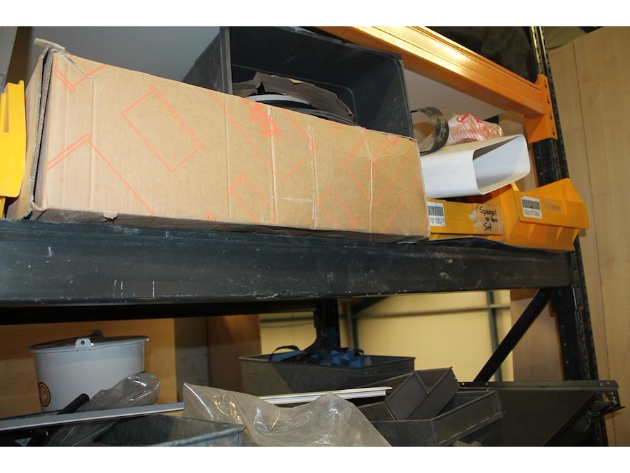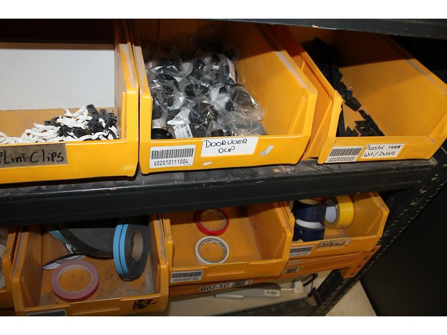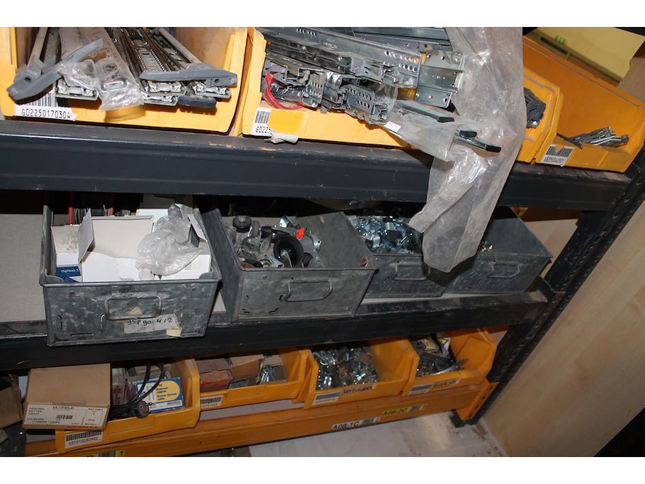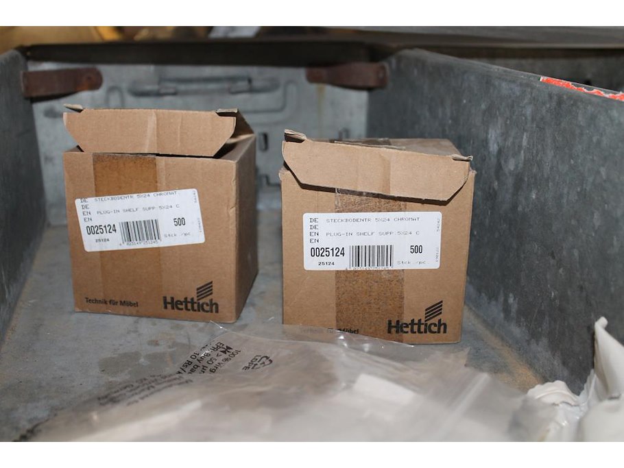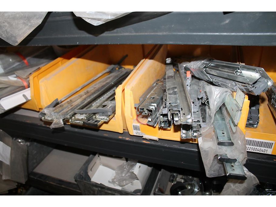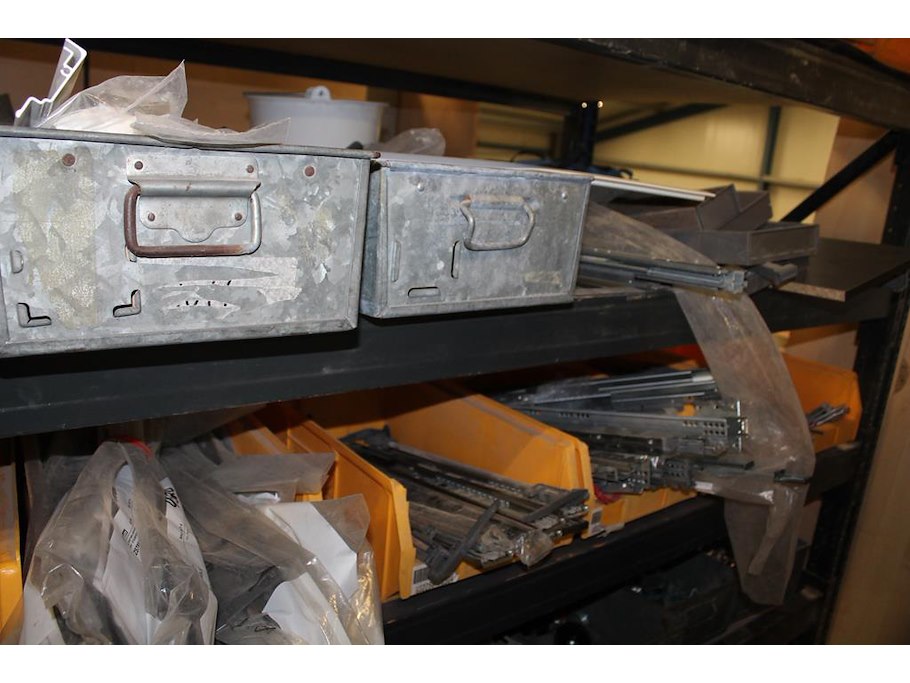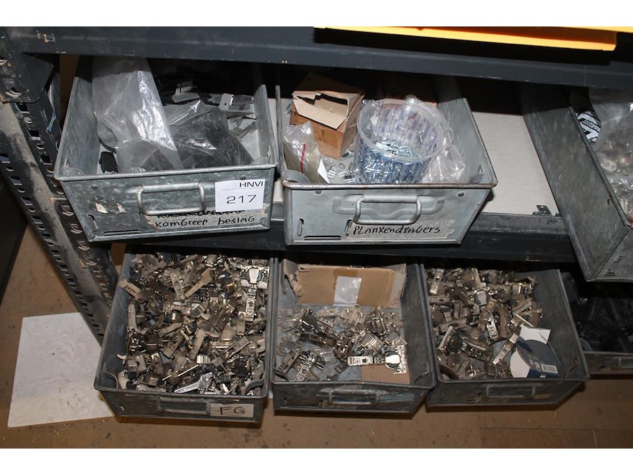 Meubelmontagematerialen waaronder scharnieren, ladegeleiders, val/klapscharnieren, plankendragers, wieltjes, meubelpoten, LED/strips, plintenclips, deuvels, enz. in en om metalen en kunststof bakken op 10 schappen.