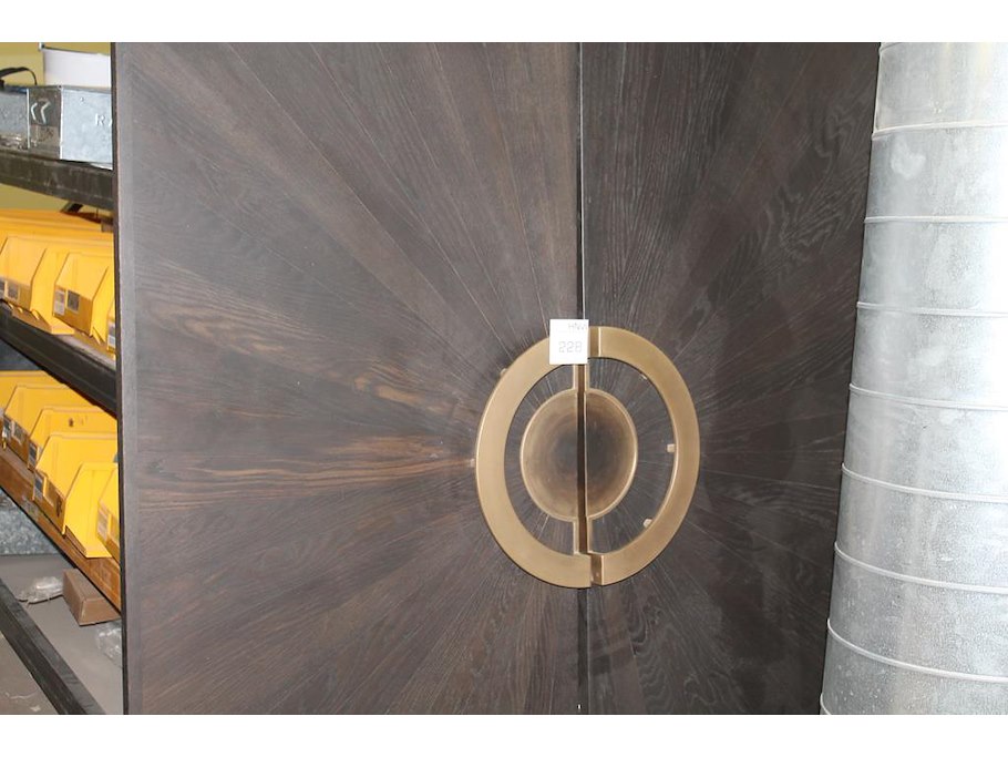 Twee houten kastdeuren a 75 x 247 cm en dikte 27 mm, spiegelend ingelegd en met bijzonder deurbeslag. Verkoopprijs € 16.000.-