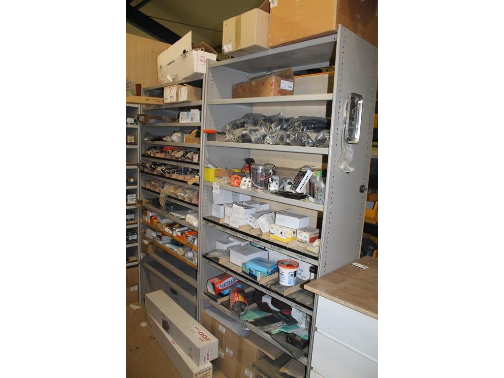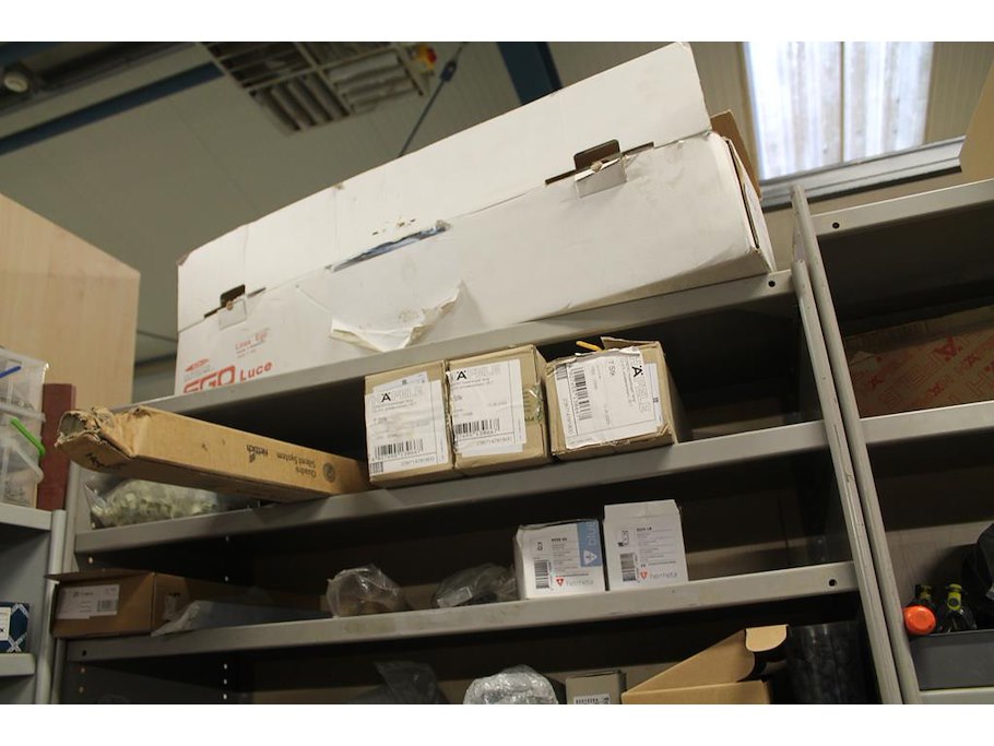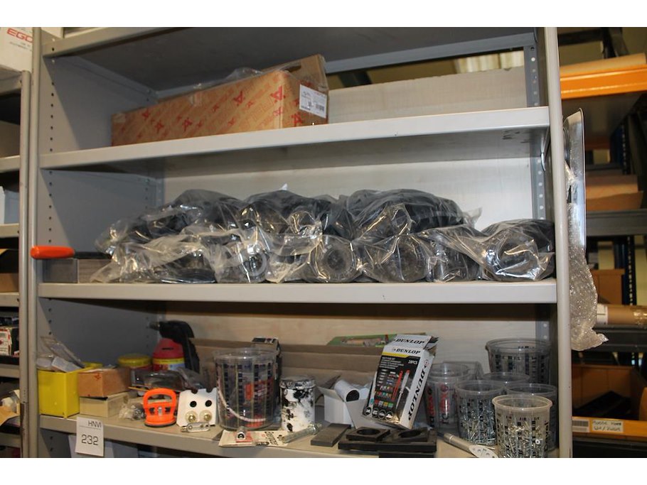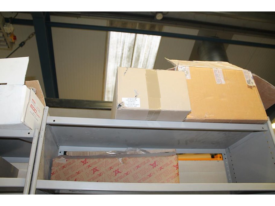 Twee metalen vakkenkasten a 102 x 43 x 210/220 cm met inhoud waaronder schuurpads, plastic zakken, schroeven, nieten, jashaken, broekbeugels, kledingophangsystemen, enz. Let op! Kasten staan op de eerste verdieping.
