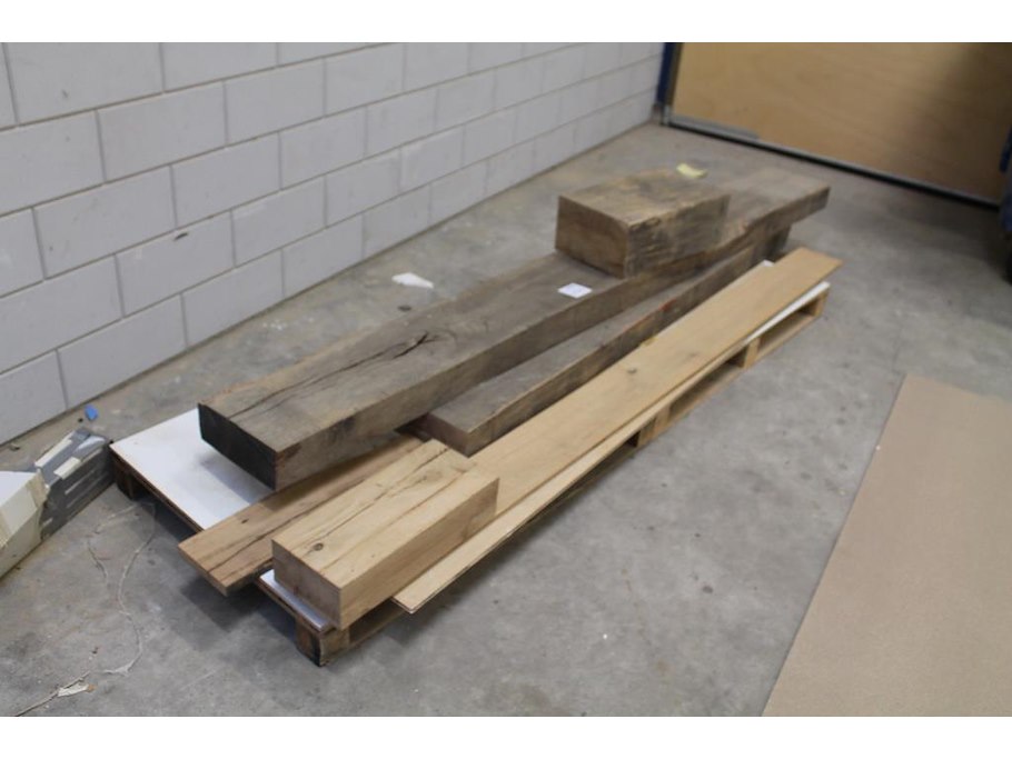 Eiken balken waaronder 287 x 10.3 x 274 cm en planken op pallet.