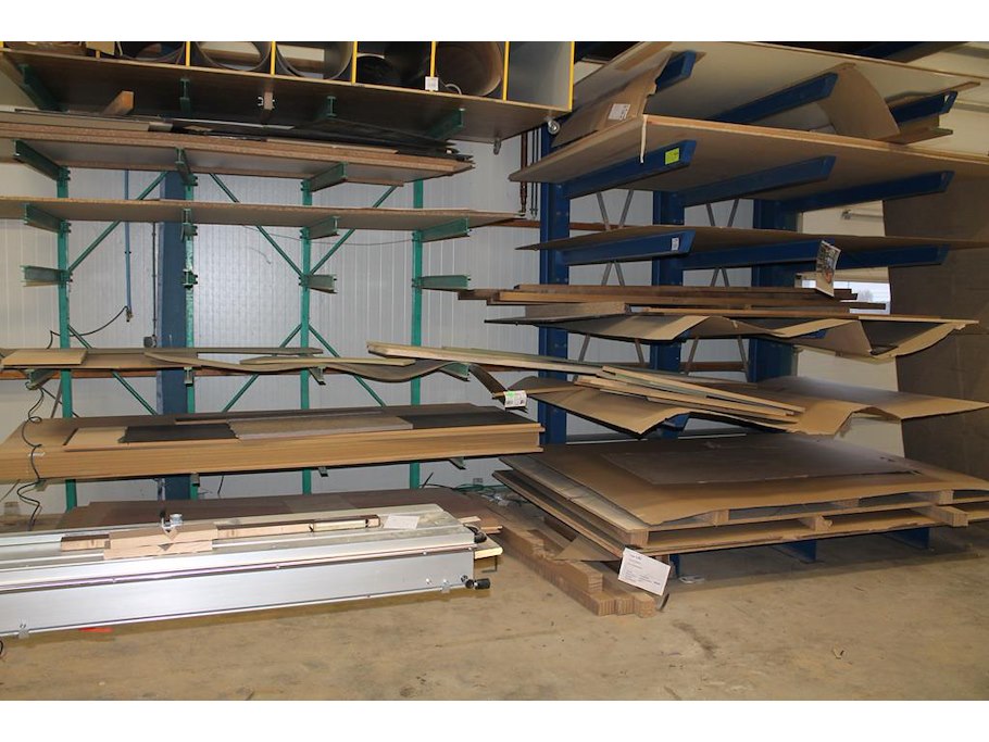Plaatmateriaal waaronder zes x MDF 122 305 18 mm, gelamineerd spaanplaat, gelamineerd MDF en enkele eiken balken in twee draagarmstellingen. Let op! Exclusief draagarmstellingen.