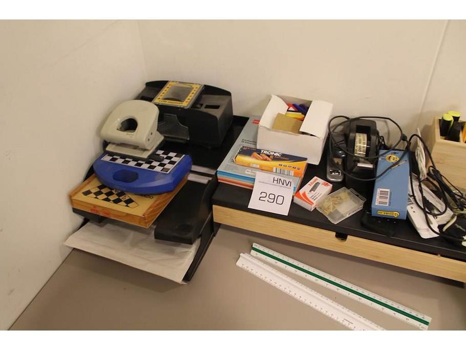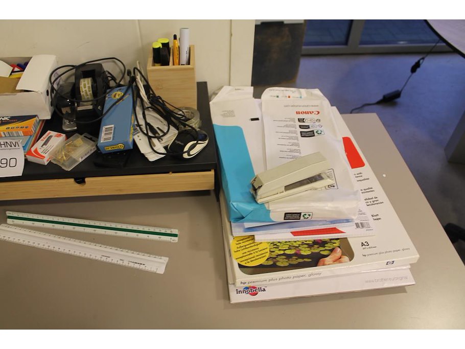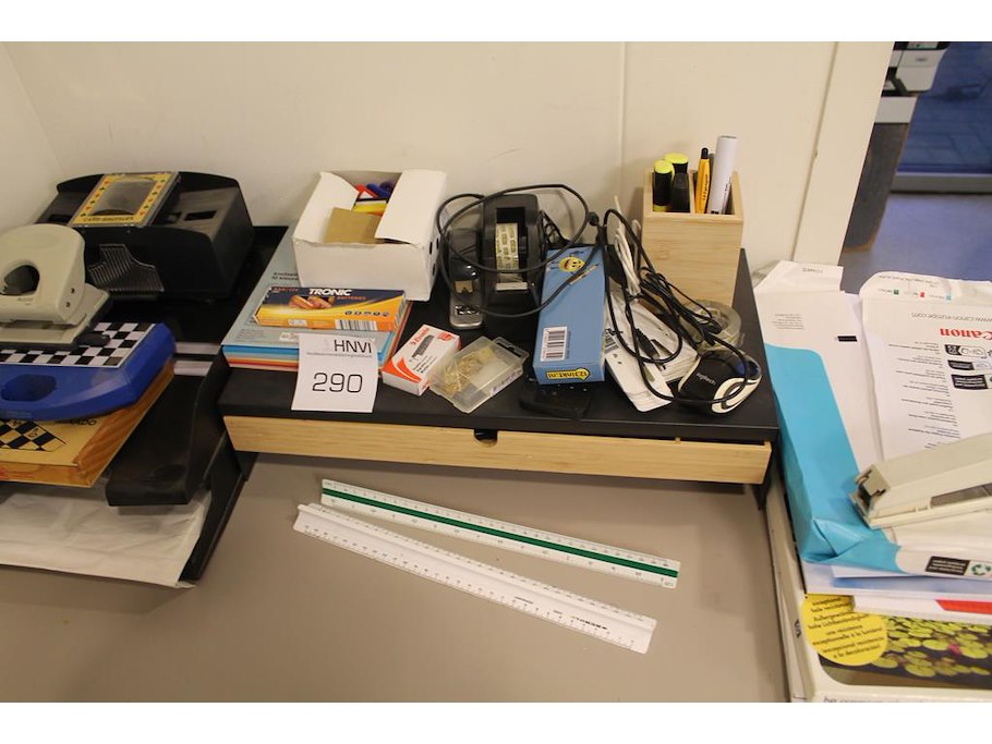 Kantoormaterialen waaronder bureau organiser, spellen, schrijfgerei, fotopapier, linialen, enz.