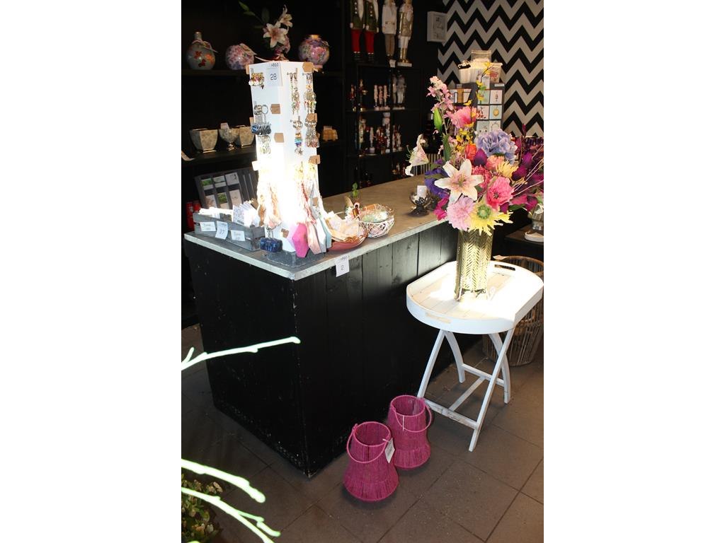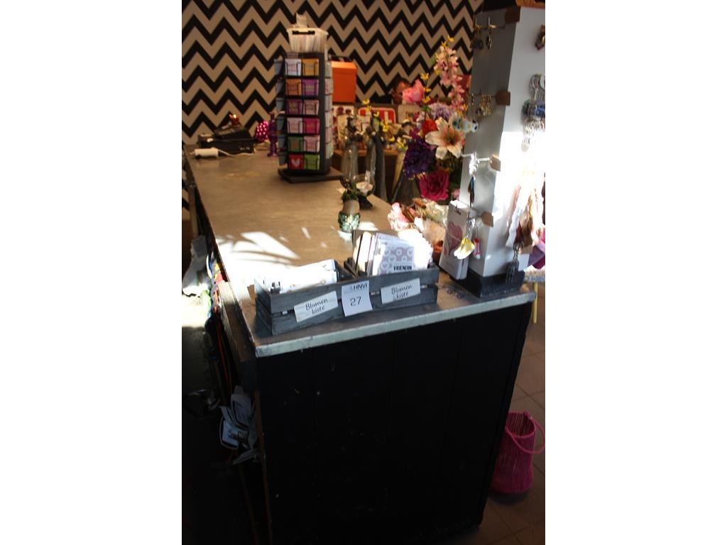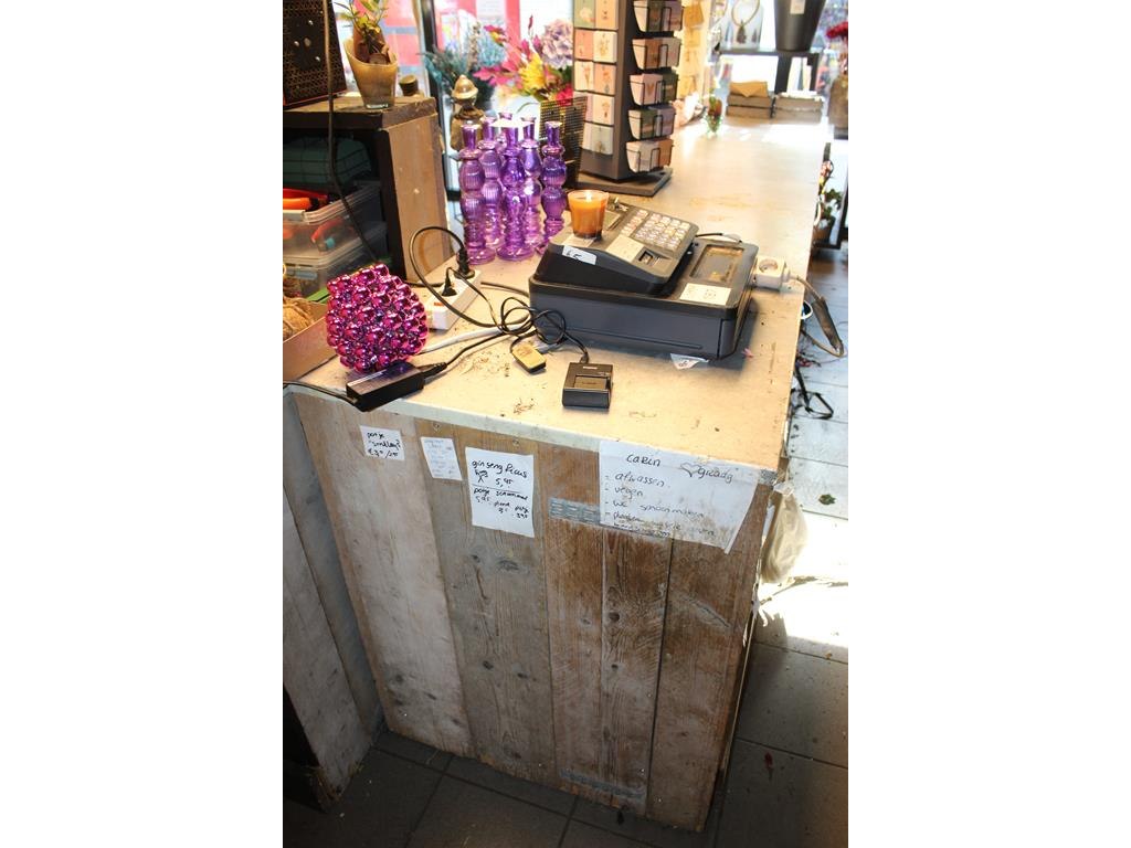 Houten balie met metalen blad in hoekopstelling met verkoop- en inpakgedeelte. Afmeting 290 x 375 x 99 cm.