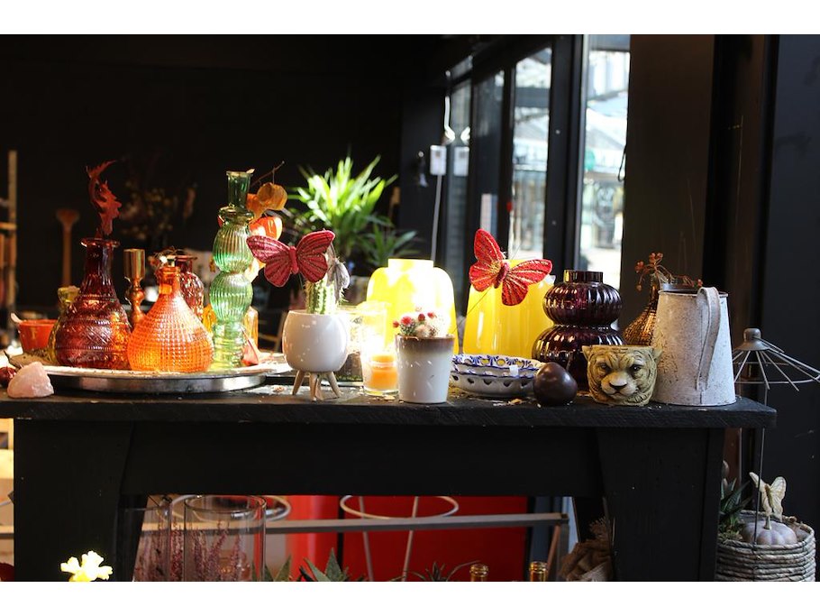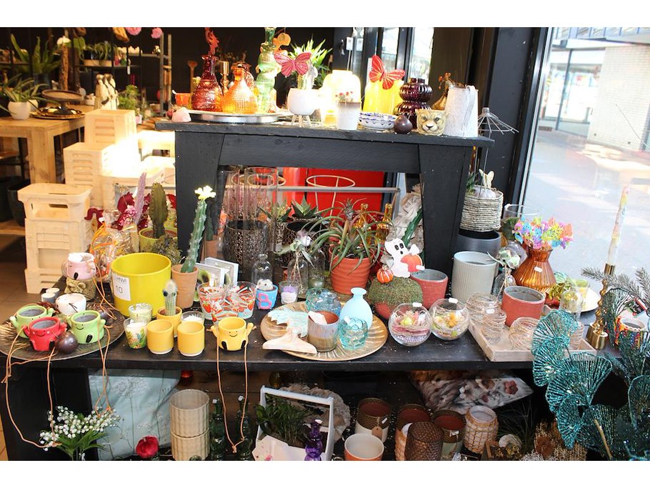 Winkelproducten in en op showtafel w.o. vaasjes, kandelaars, decoratiematerialen en cactussen.