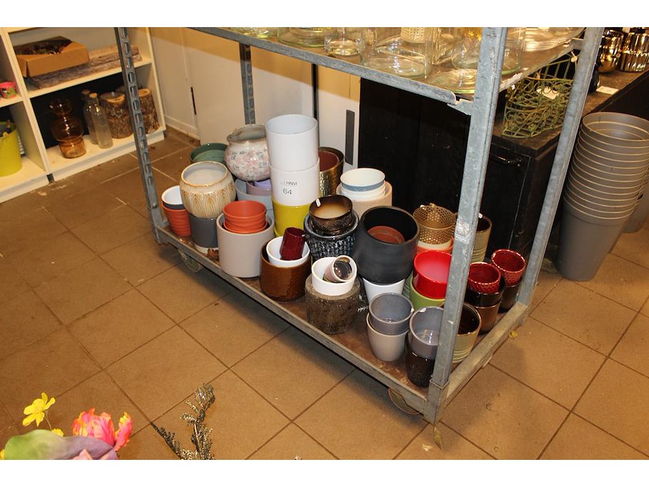 Bloemen en plantenpotten op schap in diverse maten en uitvoeringen.