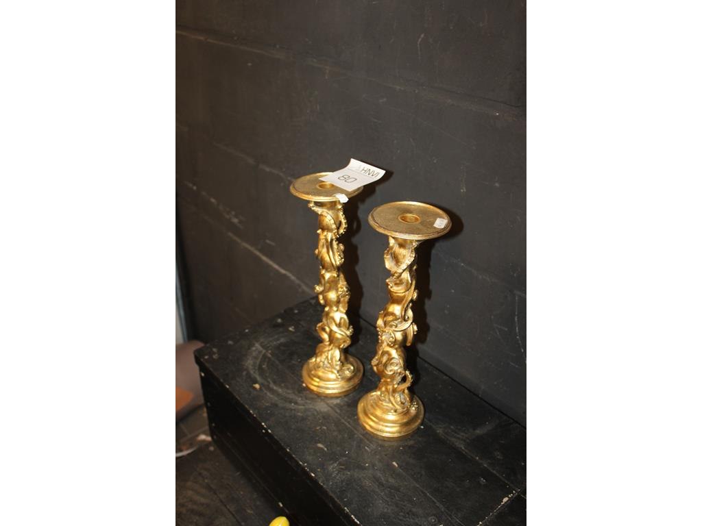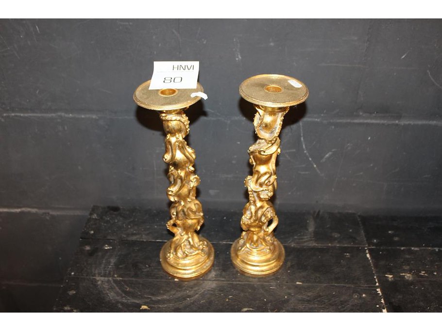 Twee goud kleurige kandelaars hoogte 35 cm.