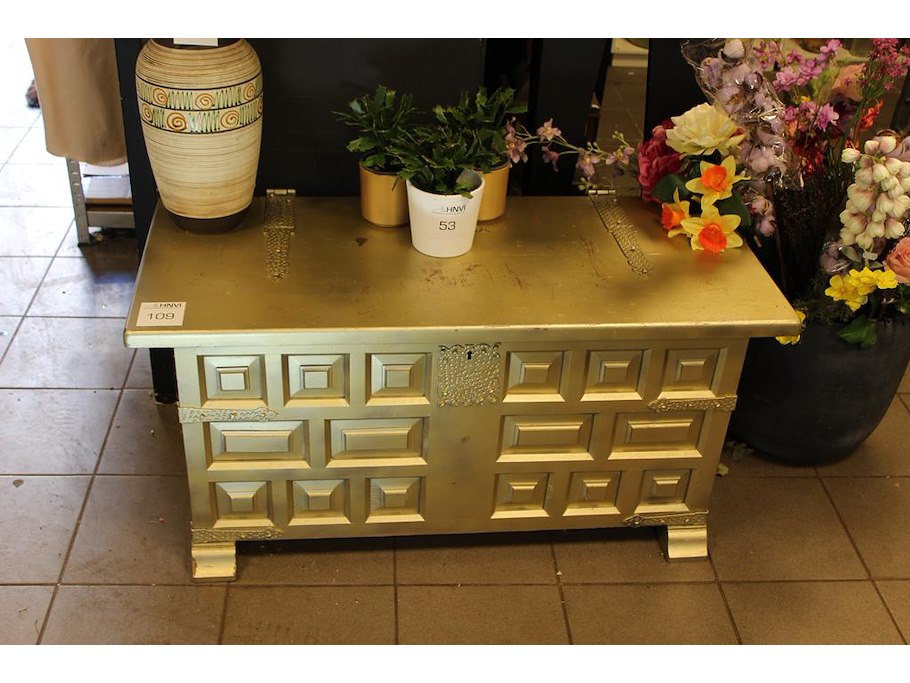 Goudkleurige dekenkist. Afmeting 110 x 48 x 54 cm.