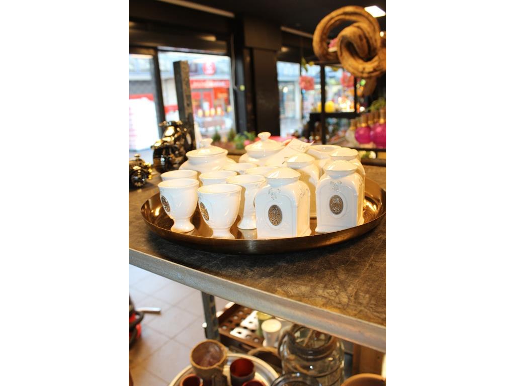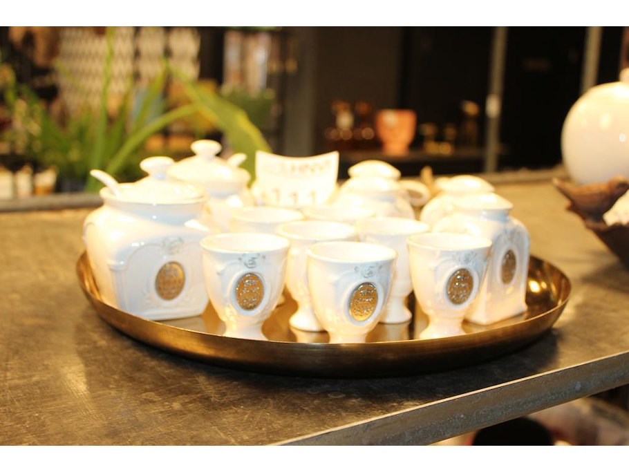 Eierdopjes, peper- en zoutstellen en suiker- en roomstellen op dienblad.