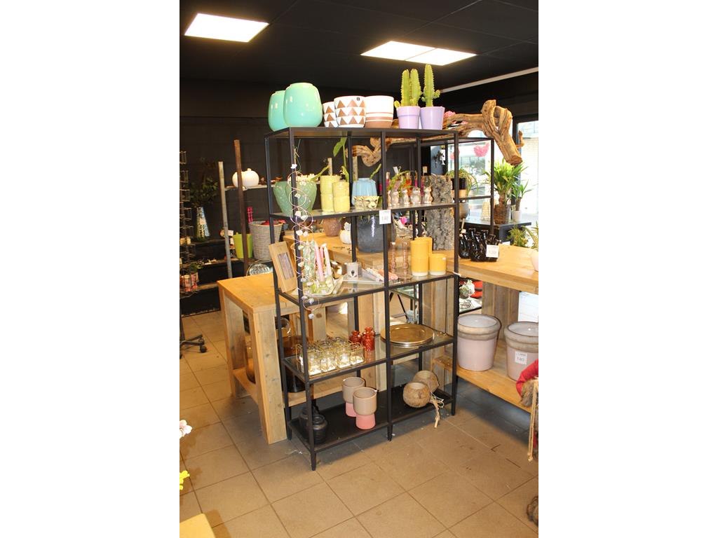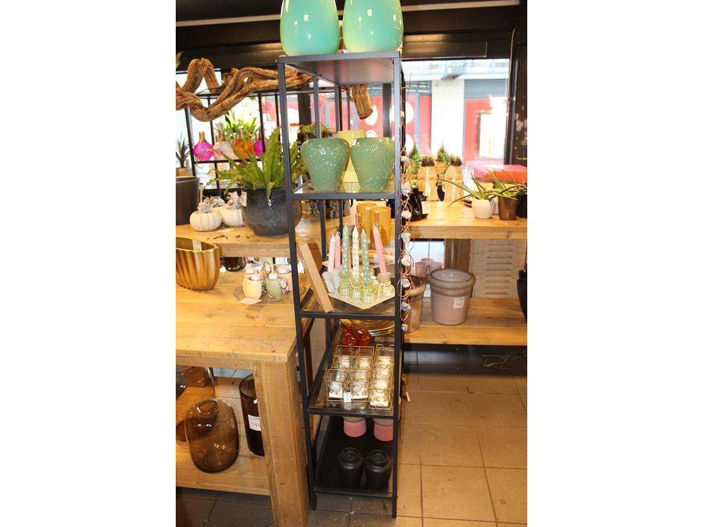 Drie metalen stellingkasten met glazen legbladen. afmeting 100 x 36 x 180 cm.