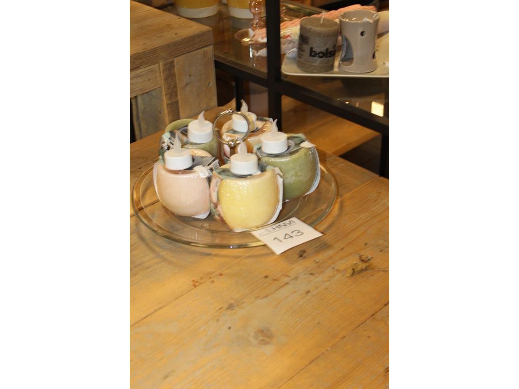 Vijf aroma bowls op glazen onderzetter.