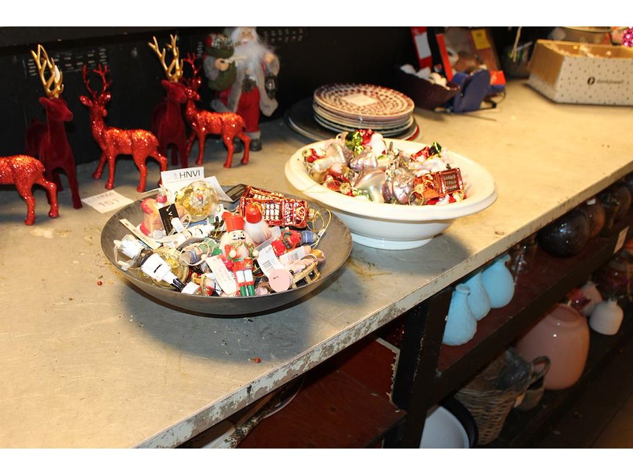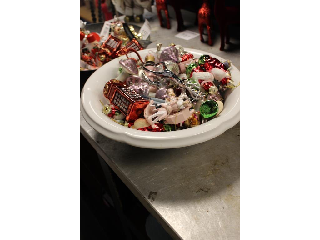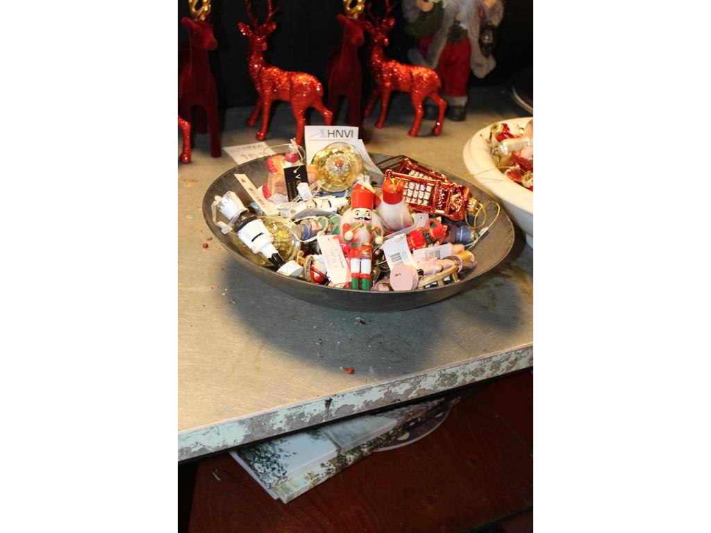Grote hoeveelheid Kerstboom versiering w.o. notenkrakers, herten, paddenstoelen, schaatsen, telefooncellen etc. in twee schalen.