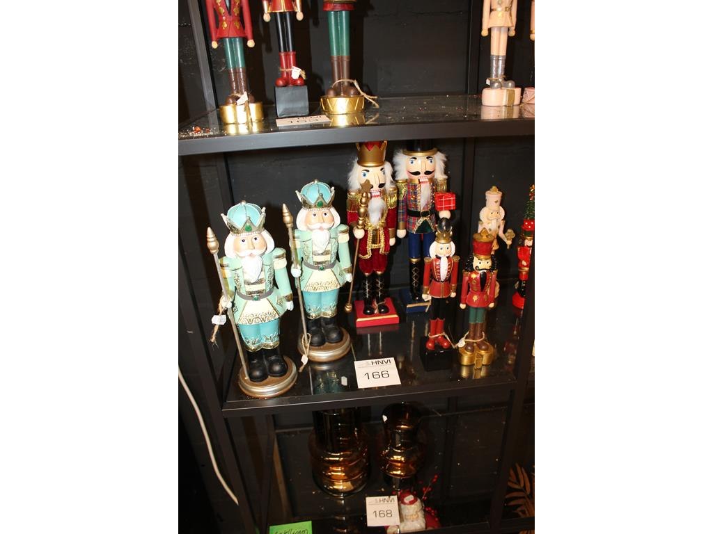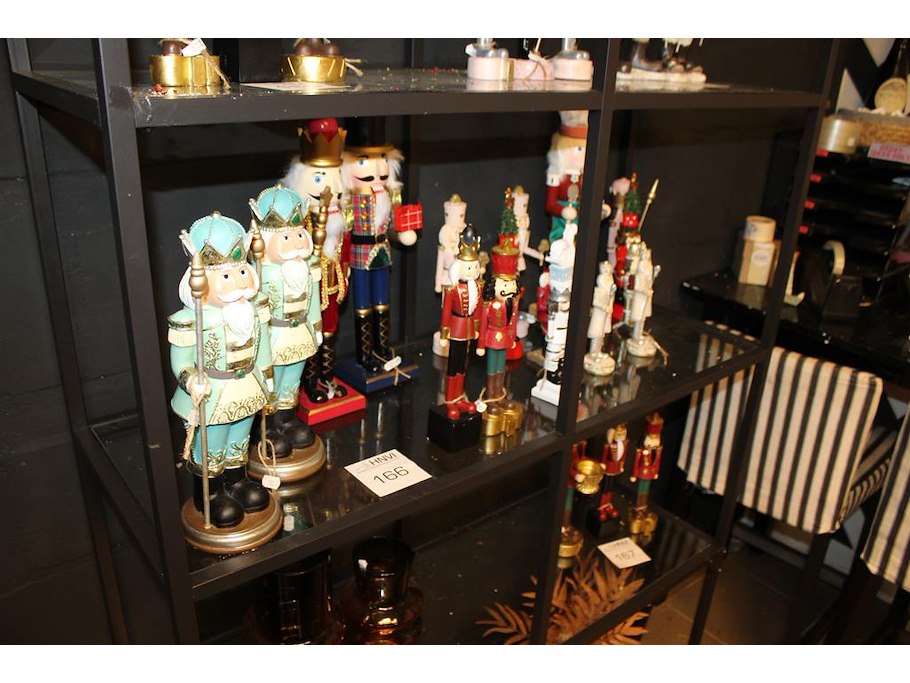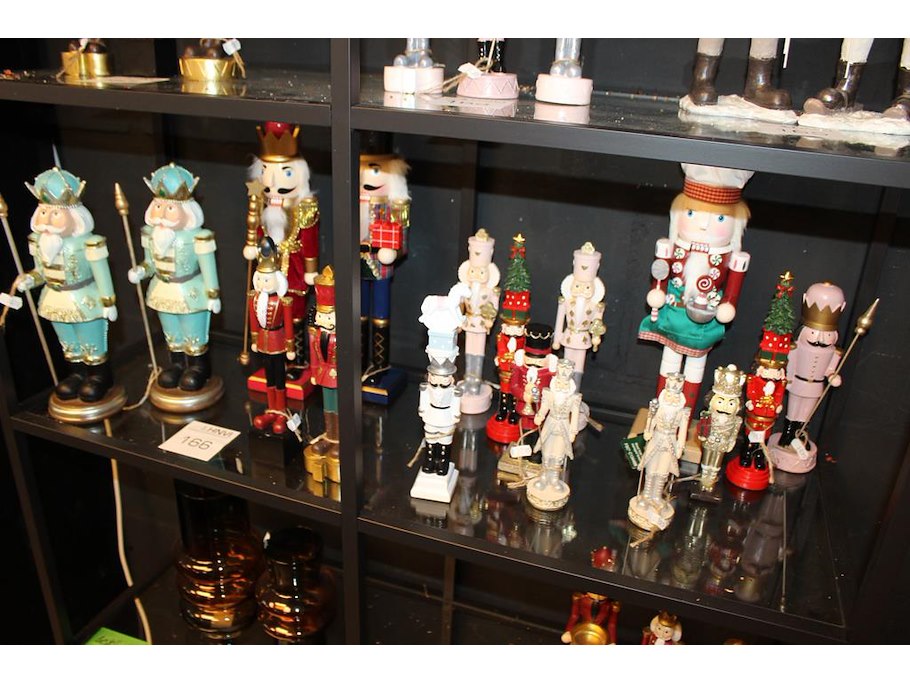 17 notenkrakkers op schap in diverse maten en uitvoeringen.