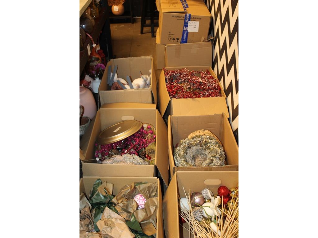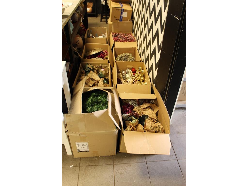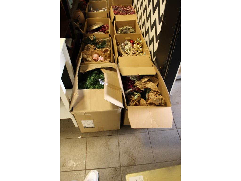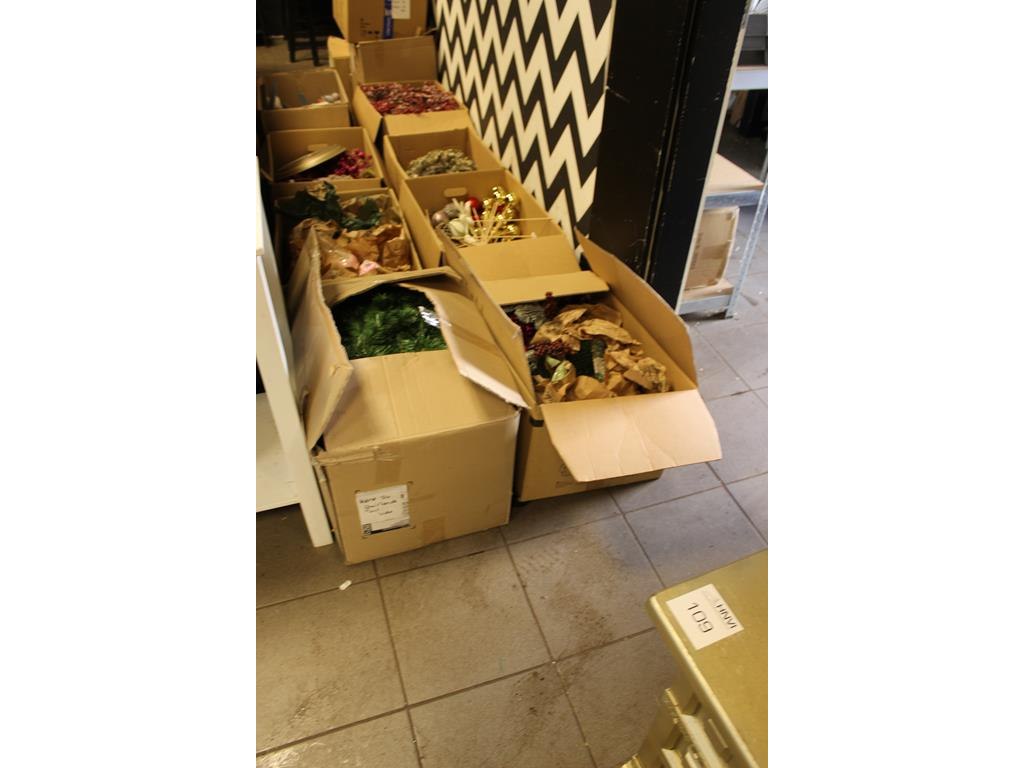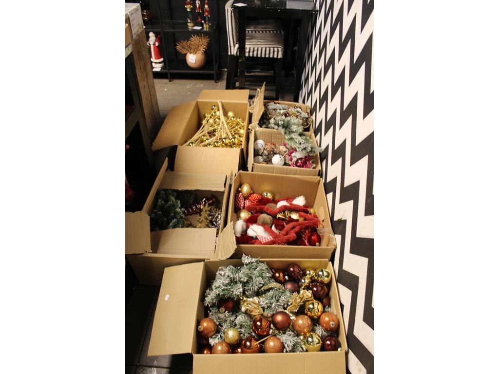 Kerstmaterialen in 14 dozen o.a. ballen, bomen, decoratie etc.