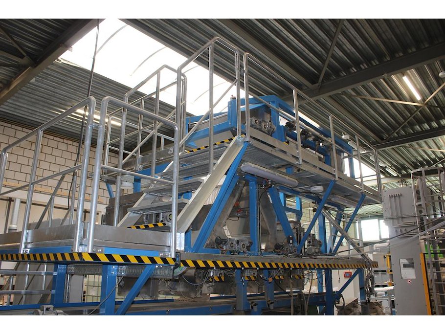 Proefproductieopstelling bestaande uit mengmachine met trechters, diverse spuitkoppen, lopende band, trappe...