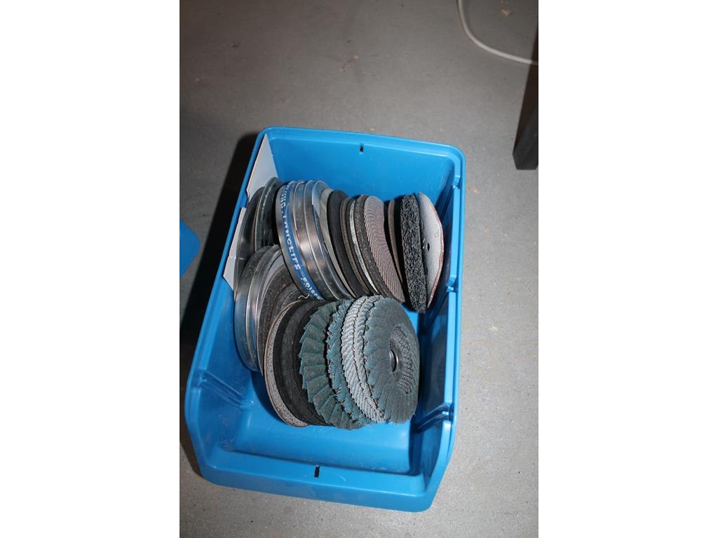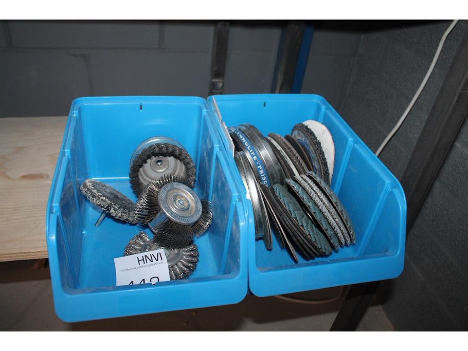 Schuur-, polijst en slijpschijven in 2 kunststof bakjes.