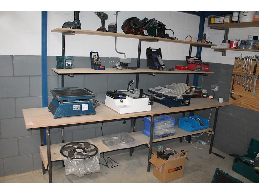 Werkbank met onderplateau en dubbel wandschap. afmeting 301 x 60 x 88 cm. let op: exclusief producten op en...