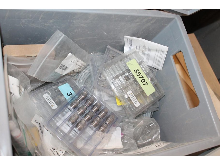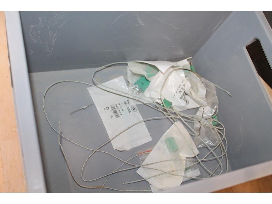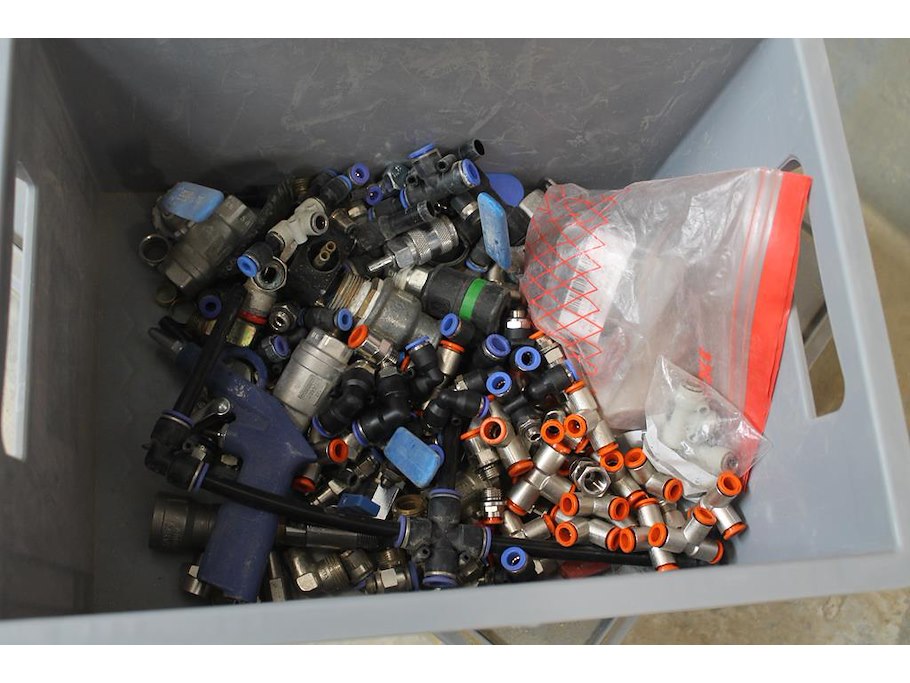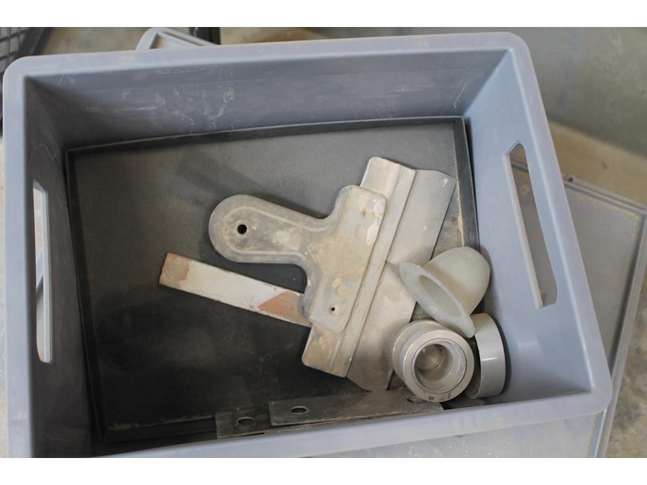 Vijf kunststof kratten met diverse machine onderdelen.