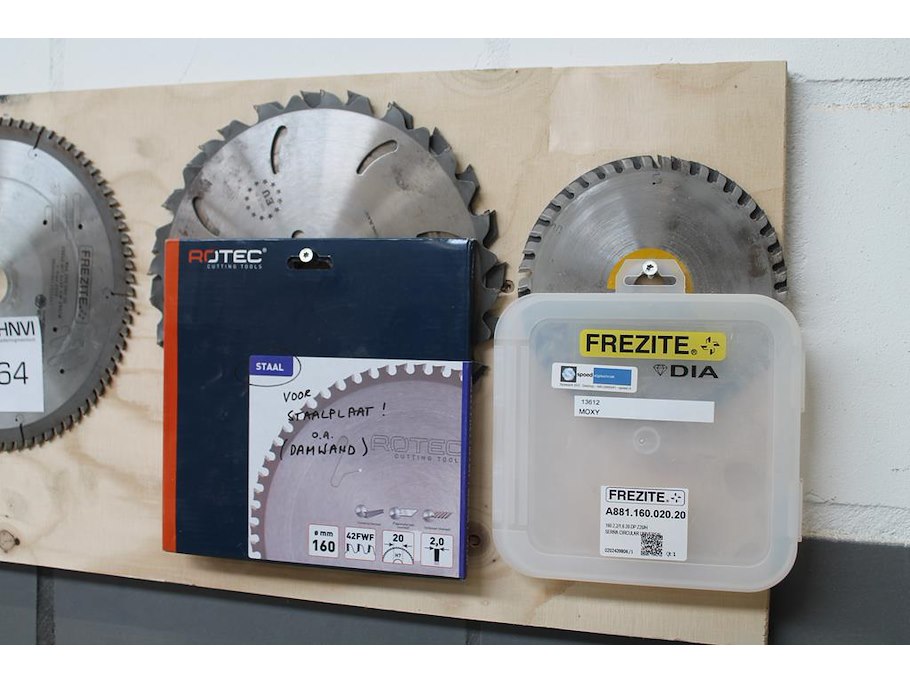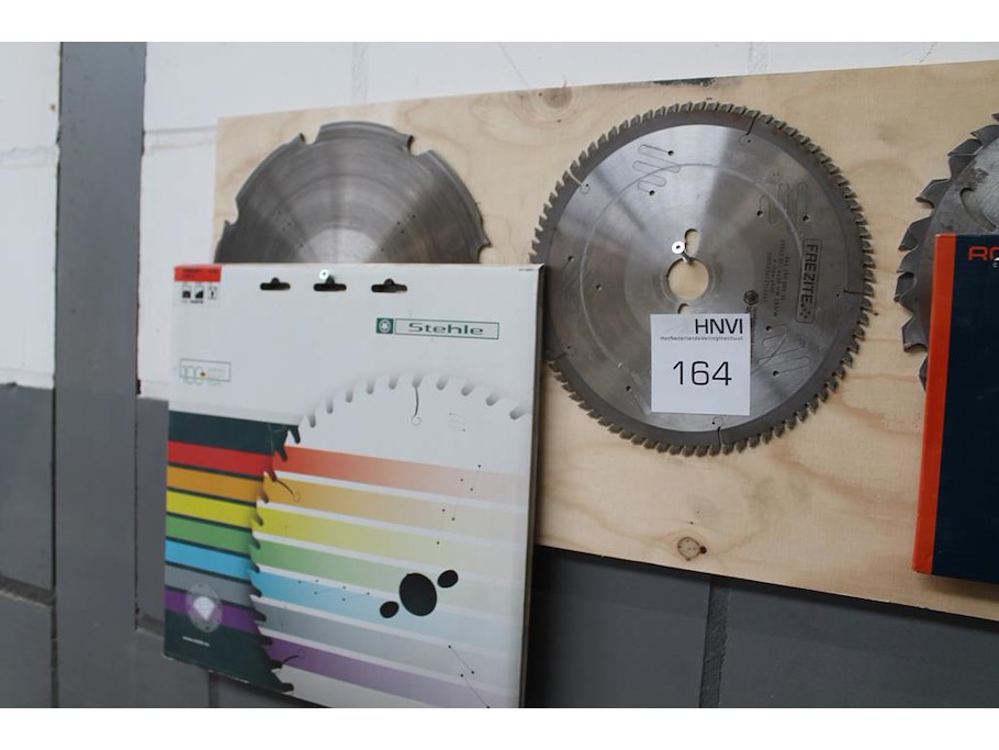 Acht zaagbladen aan wandrek.