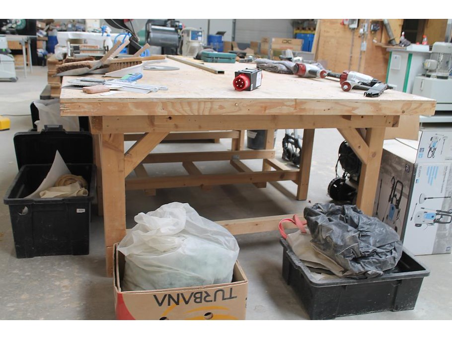 Houten werktafel met afmeting 183 x 248 x 90 cm. Let op: exclusief kavels op de werktafel.