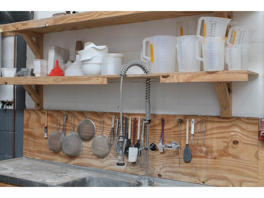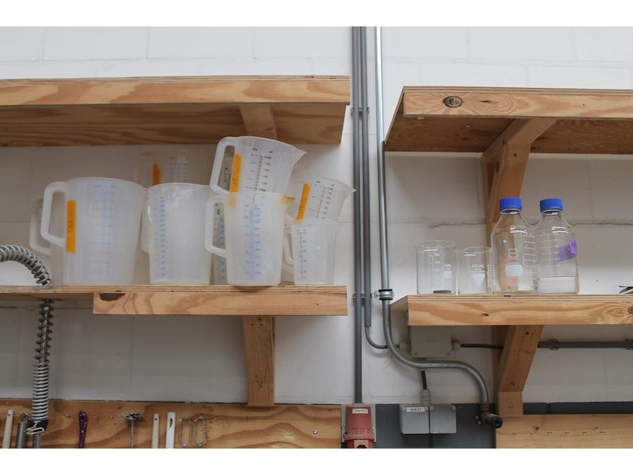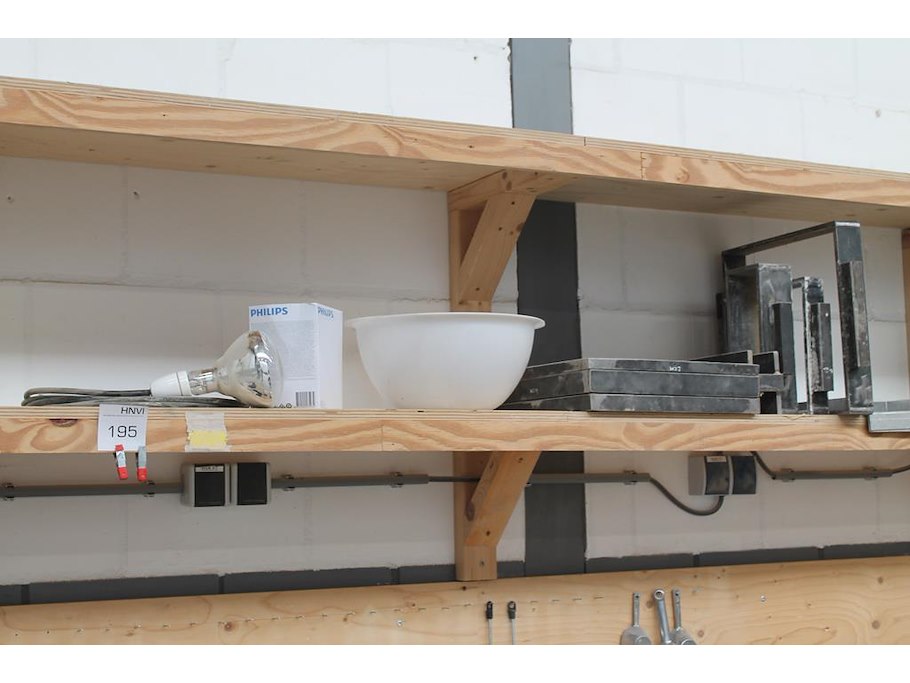 Laboratorium- en testproducten aan achterwand en op schap w.o. zeven, maatbekers, trechters, spanen, mengbekers, etc.