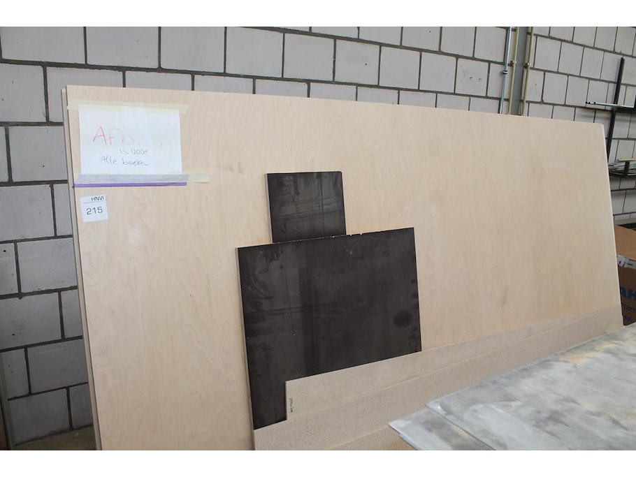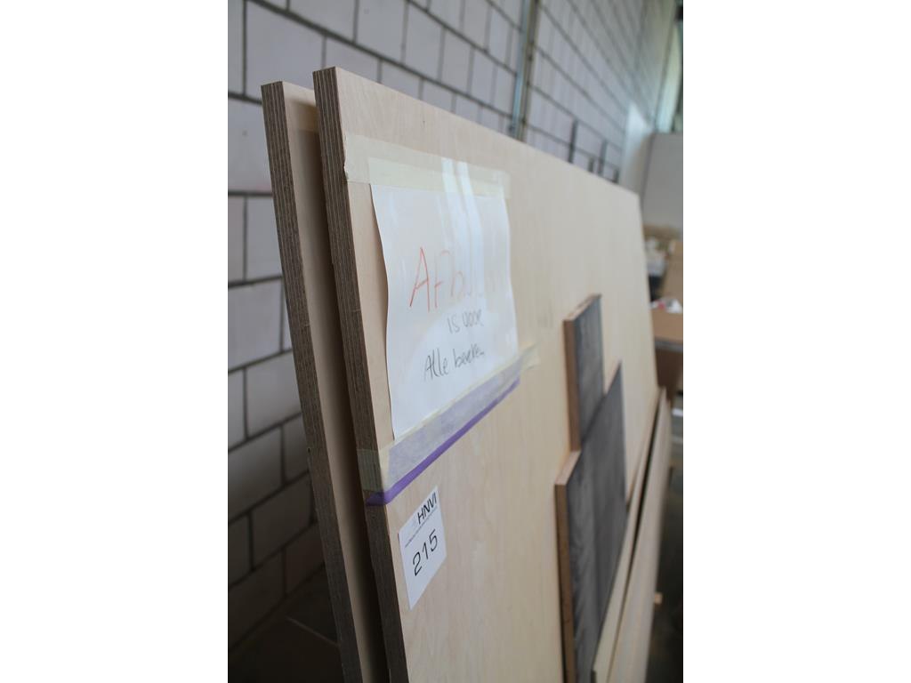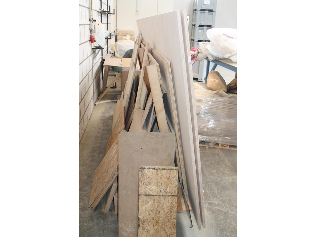 Platenbok met divers plaatmateriaal en restant platen w.o. 3x multiplex berken 18 mm met afmeting 305 x 152 cm.