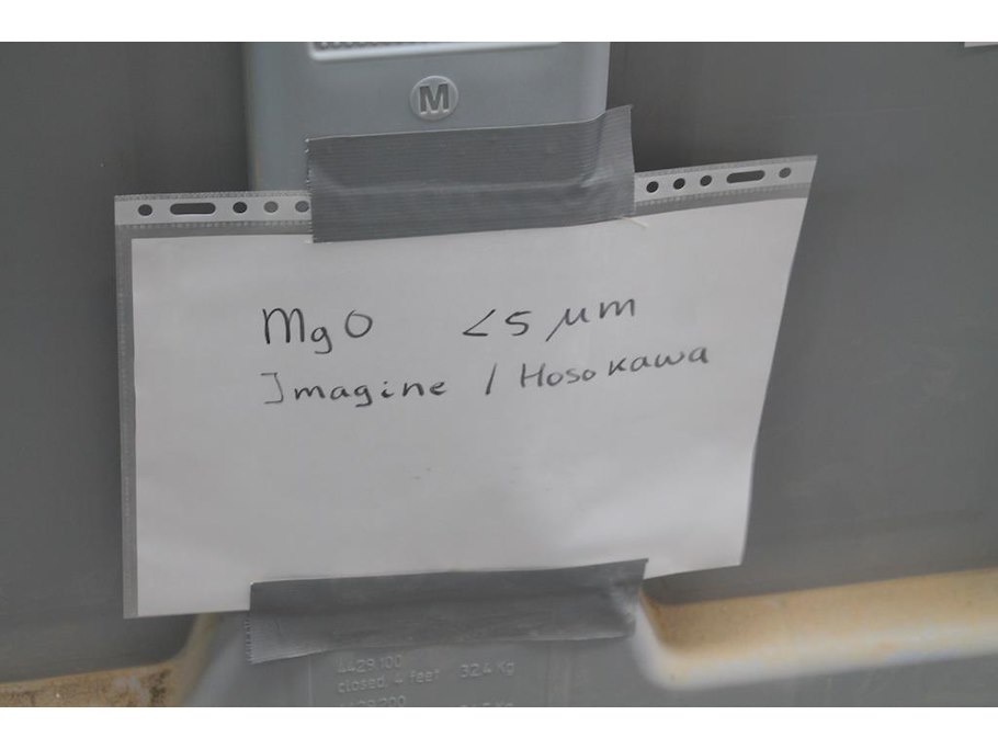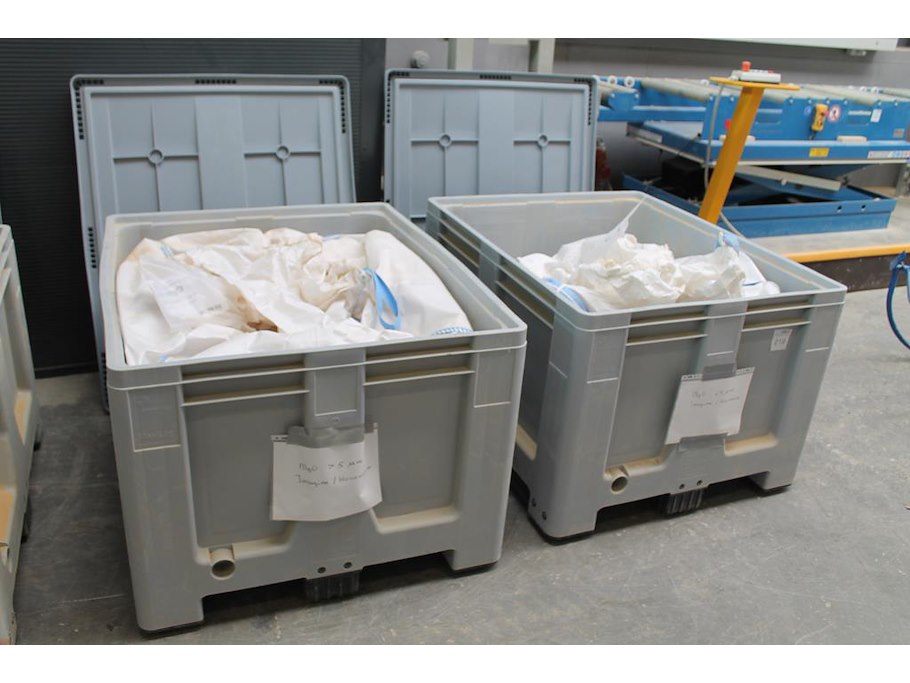 Twee kunststof palletboxen SCHOELLER ALLIBERT met deksel. Boxen zijn deels met MgO in 2 deeltjesgrootte.