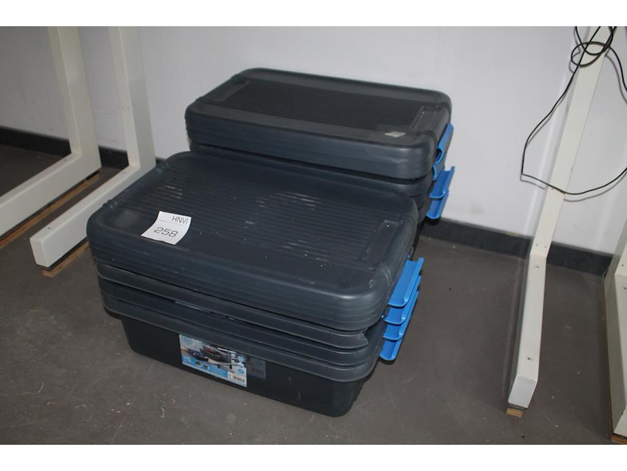Acht kunststof boxen met deksel. afmeting 57 x 38 x 18 cm.