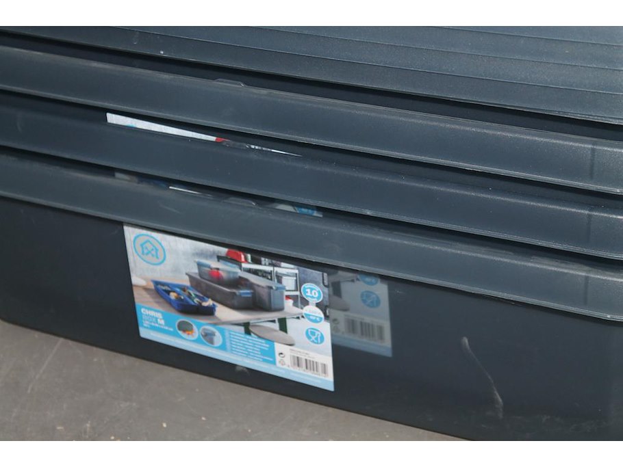 Acht kunststof boxen met deksel. Afmeting 57 x 38 x 18 cm.