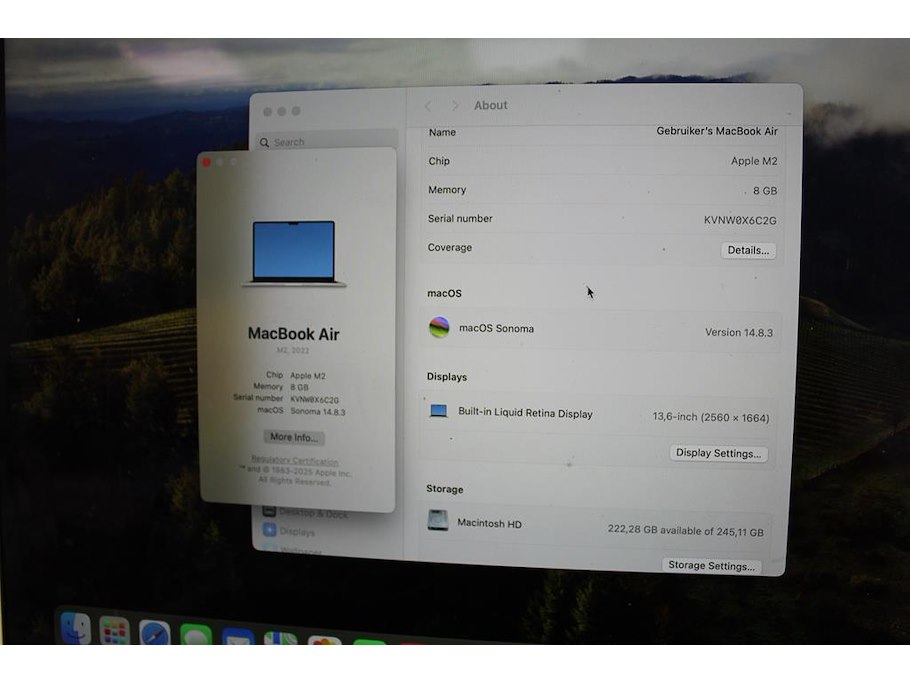 Macbook air m2 2022 14,2 model a2681 emc 4074. werkgeheugen 8 gb. 256 gb ssd. maos sanoma. 13,6 inch terina...