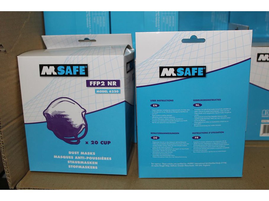 1560 stofmaskers m-safe 6220 ffp2 in vier overdozen. totaal 1560 stuks.