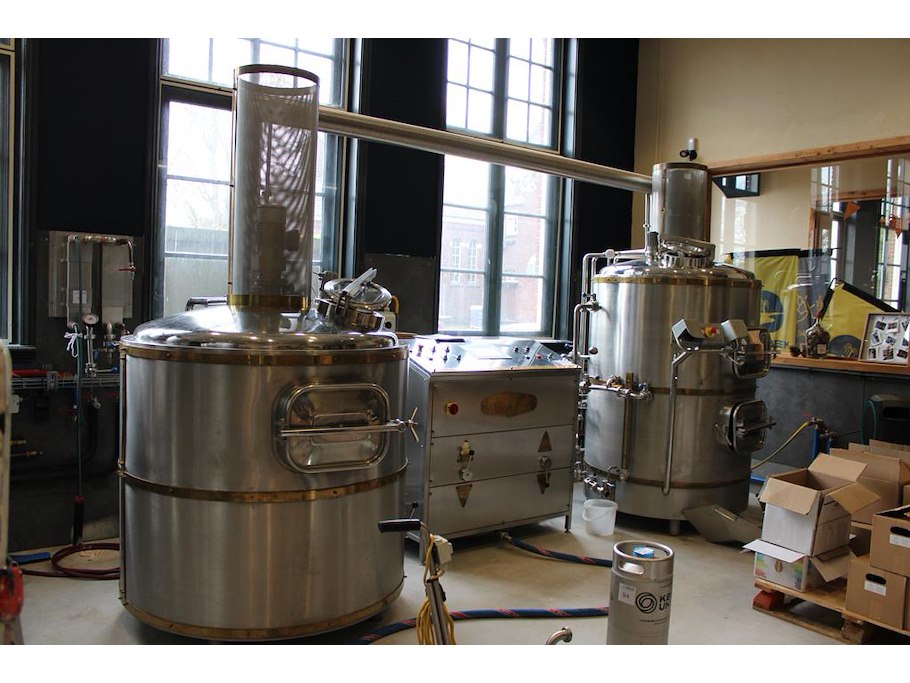 Brouwhuis labu brau three-vessel-brewhouse brewing block 5/10 hl bestaande uit kookketel, filterkuip en een... onderdeel van combinatiekavel complete mini brouwerijopstelling bestaande uit brouwhuis, 8 gistingstanks (deels gevuld), bottellijn, pompen, warmtewisselaar, natte lijn etiketteermachine en chiller
