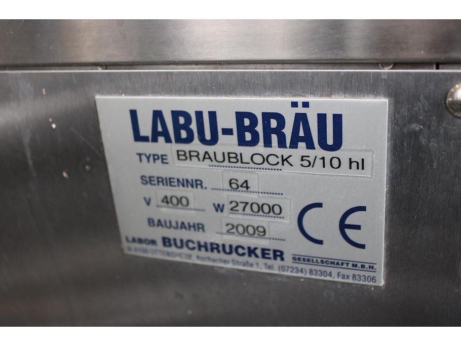 Brouwhuis LABU BRAU Three-Vessel-Brewhouse Brewing Block 5/10 Hl bestaande uit kookketel, filterkuip en een whirlpool. Maximaal 1000 liter. Volledig vervaardigd uit RVS, 2 ge-integreerde pompen en uitgerust voor CIP-reiniging. Via driewegkleppen kan geschakeld worden tussen de pomprichtingen. Vermogen 27kW / 440V. Bouwjaar 2009. Let op: Kavel is onderdeel van combinatiekavel K001.