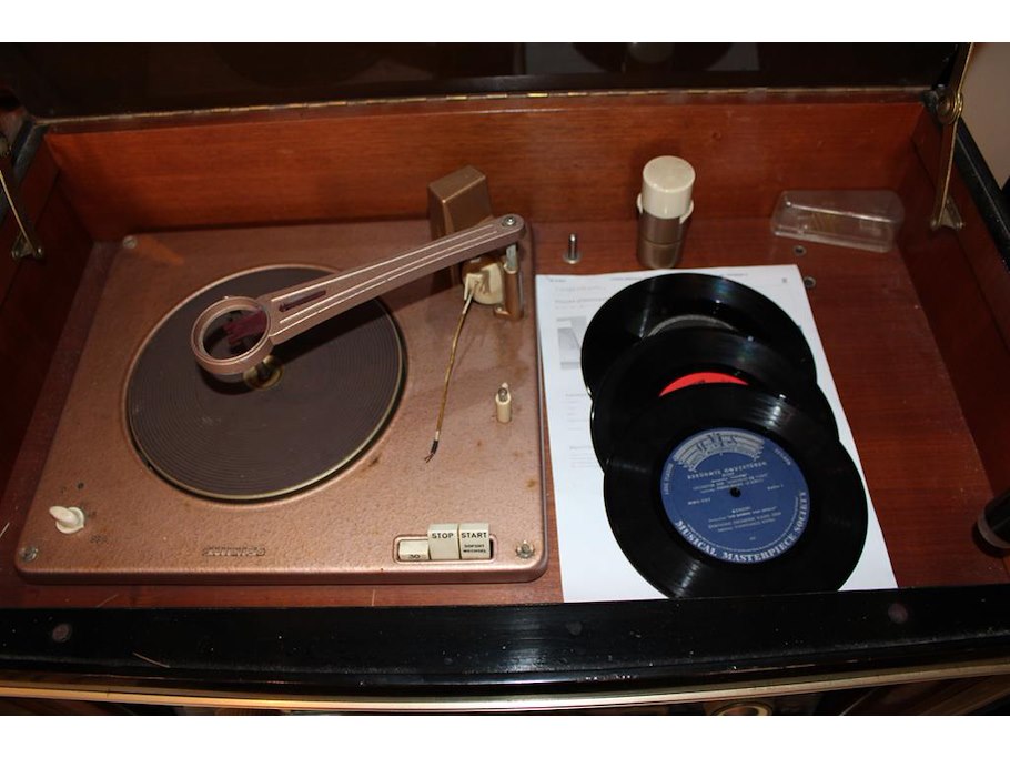 Antieke radio- / platenspelerkast PHILIPS Jupiter 652. Platenspeler defect werking radio onbekend. Afmeting 70 x 42 x 88 cm.