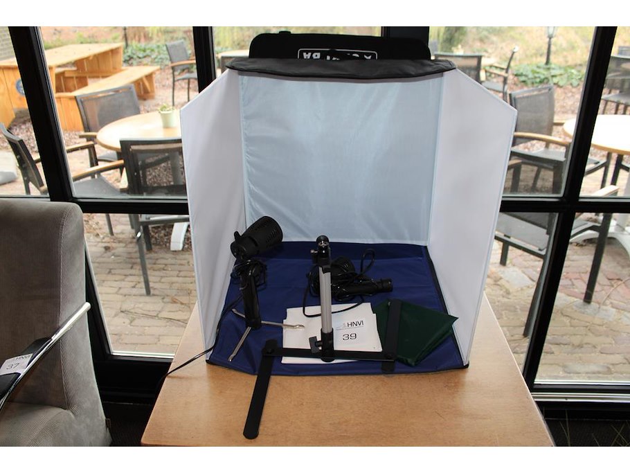 Mini fotostudio CARUBA met verlichting en camerastatief. Afmeting 50 x 50 x 50 cm.